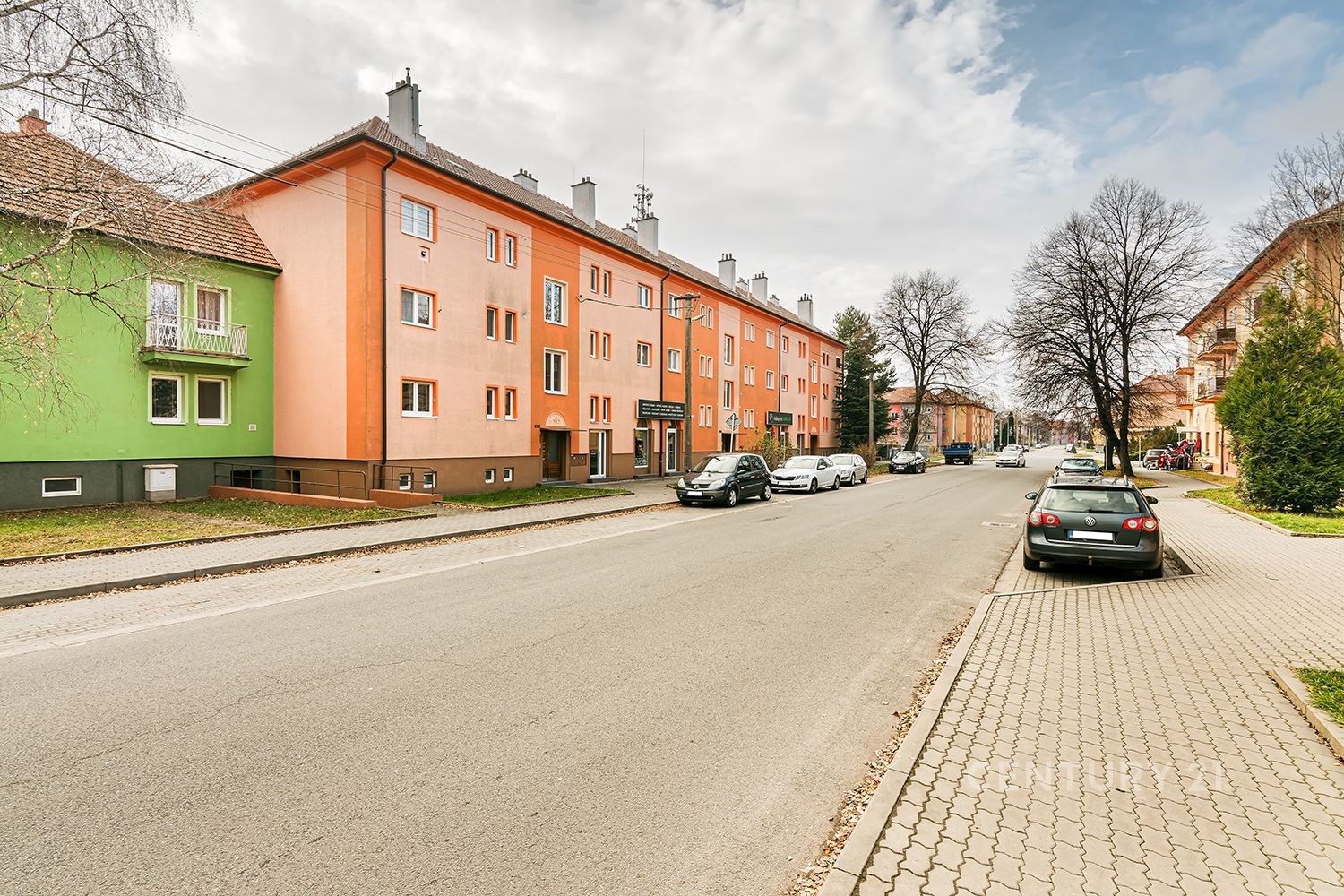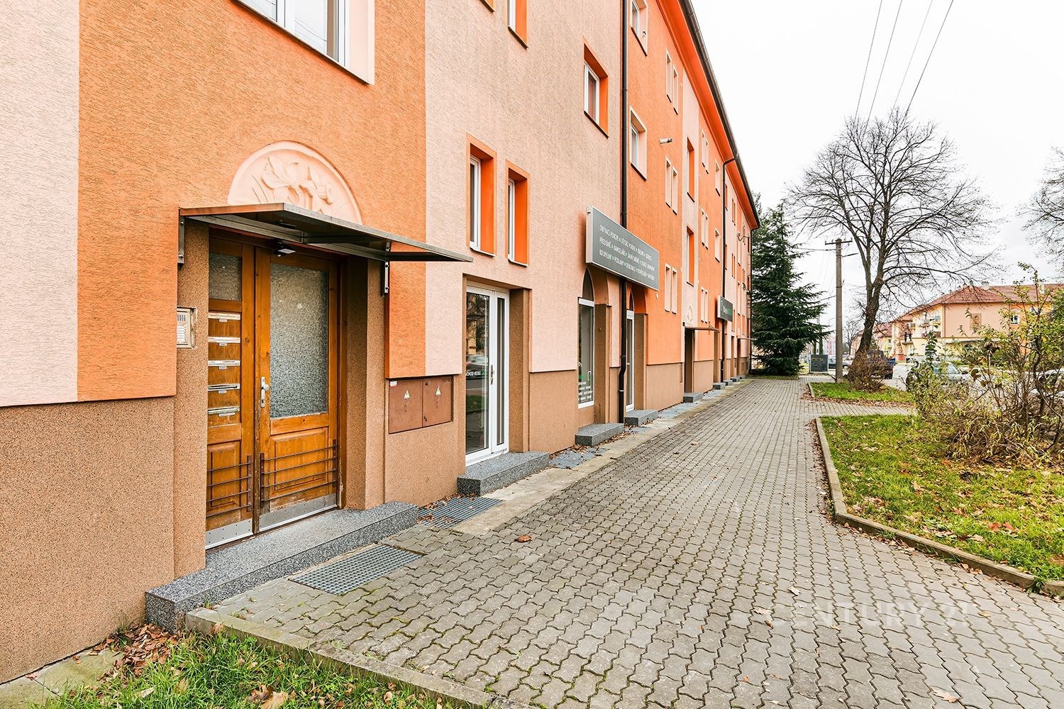 Vnitroblok je upravený, se vzrostlými stromy.