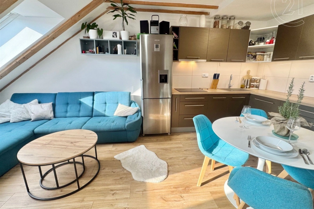 Byt je vybaven kuchyňskou linkou na míru včetně spotřebičů. V koupelně vana i sprchový kout, střešní okno a podlahové vytápění. Interiérové dveře vč. obložek v dekoru dub. Podlahy vinylové. Okna střešní plastová vč. rolet s UV ochranou. Klimatizace Sinclair ve všech místnostech. Vytápění domu plynový kondenzační kotel Baxi pro všechny 3 bytové jednotky. Ohřev teplé vody zajišťuje el. bojler v bytě. Dům po rekonstrukci (plastová okna, zateplení, fasáda, střecha). Nízké náklady na provoz bytu.