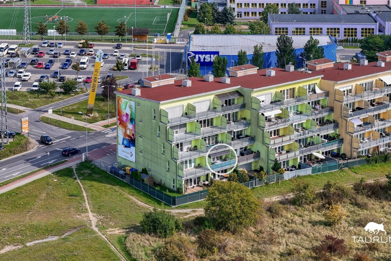 Byt samotný má podlahovou plochu 69 m2 a k tomu navíc terasa dalších 20 m2. Původně byla dispozice bytu 2kk, nyní po rekonstrukci je 3kk plus 2 šatny (jeden pokoj je bez okna). V bytě je předsíň, koupelna s vanou a místem na pračku, samostatné WC, velký obývací pokoj s kuchyňským koutem a jídelním prostorem, ložnice (bez okna) se šatnou a dětský pokoj, také se šatnou. Okna bytu jsou orientovaná na západ s výhledem do zeleně.