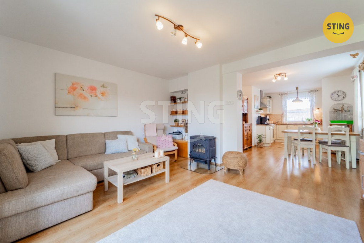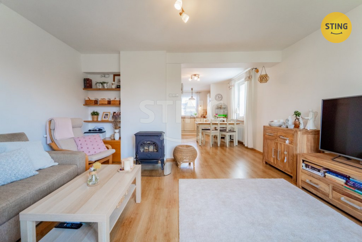 Dispozice: prostorný obývací pokoj s krbovými kamny a vstupem na balkón, jídelna s kuchyňským koutem, ložnice, dětský pokoj, koupelna a samostatná toaleta. Vytápění zajišťuje vlastní plynový kotel. Spodní bytová jednotka je rovněž k dispozici ke koupi.