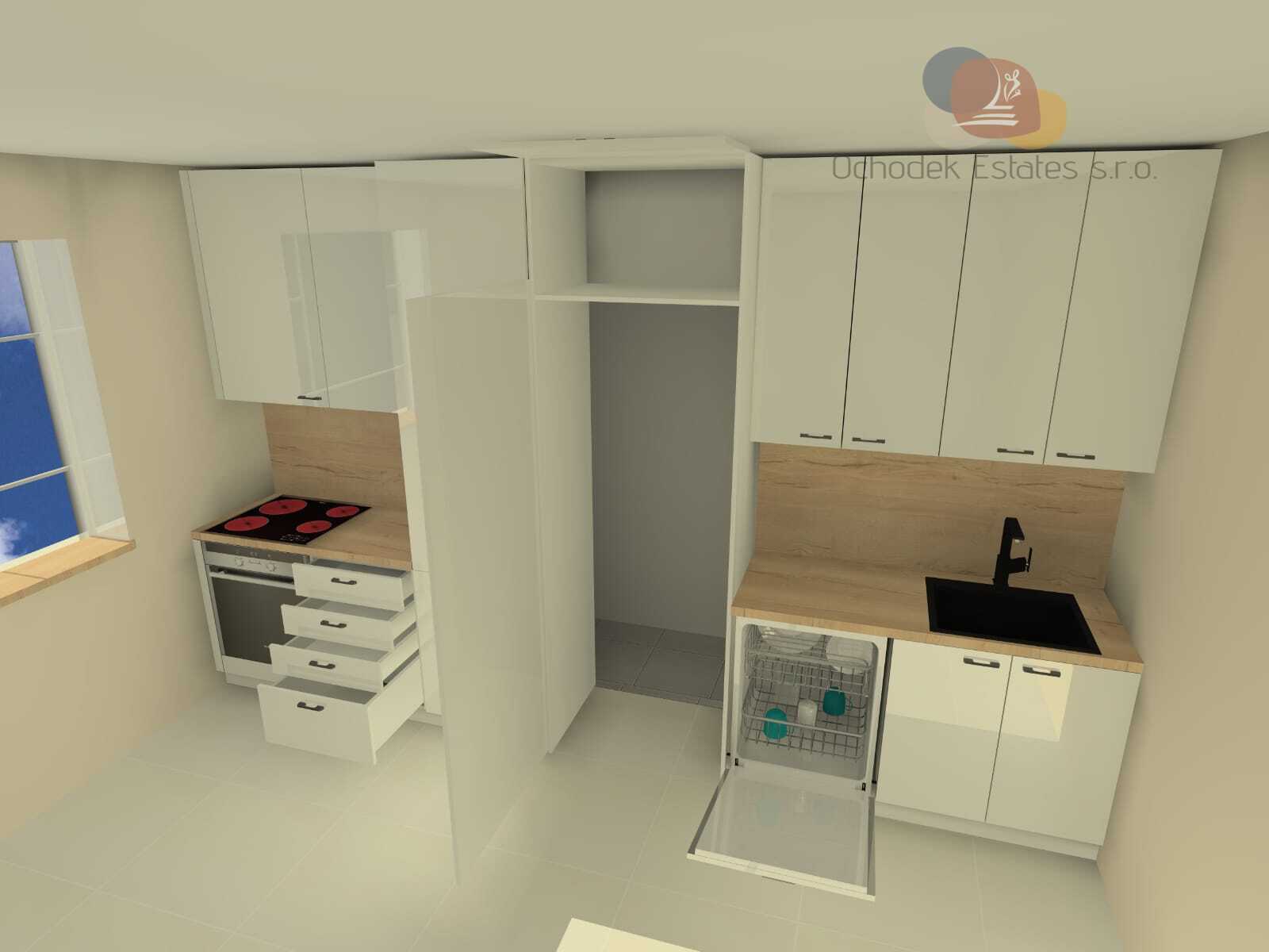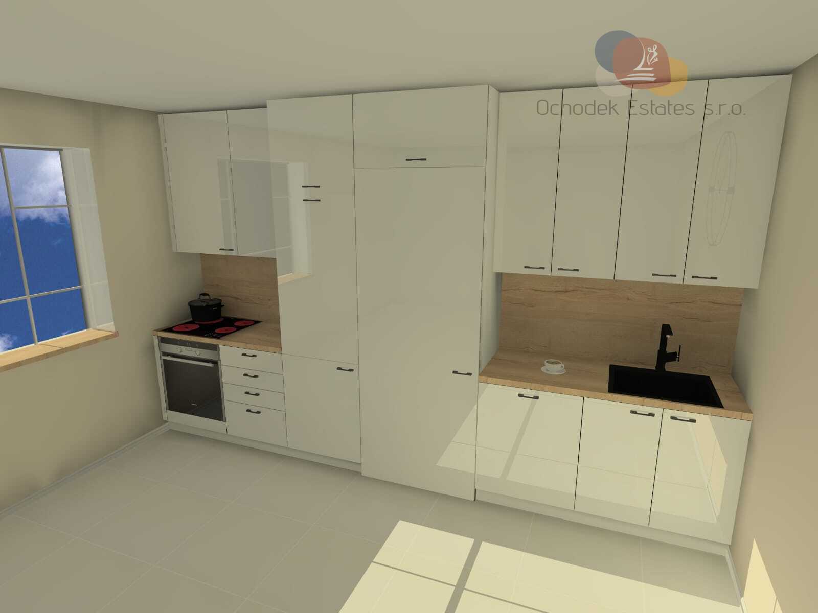 Dále pak vstoupíte do prostředního velkého pokoje s výměrou 16m2, který je rozdělen na část s rohovou pohovkou, kuchyňským koutem a jídelním stolem. Kuchyňská linka je menších rozměrů ale v galerii pak najdete zpracovaný návrh pro zvětšení na kuchyňskou linku přes celou stěnu, kdy tímto dosáhnete plnohodnotné kuchyně s dostatečným množstvím skladovacích prostor a také větší pracovní a přípravnou plochou jak pro masterchefa.