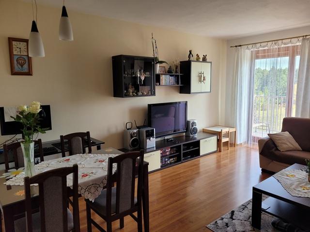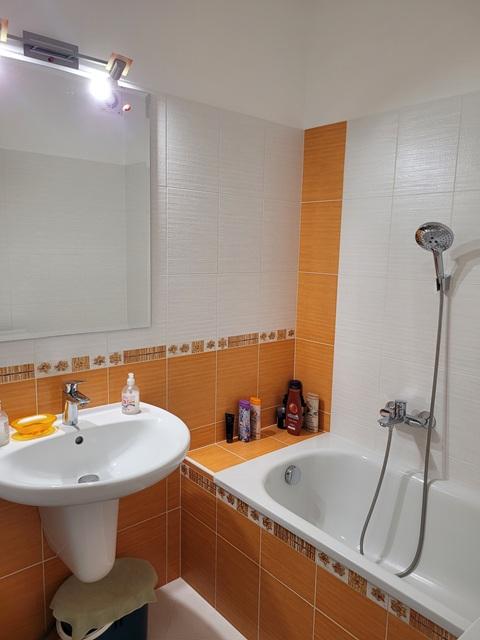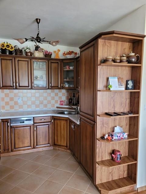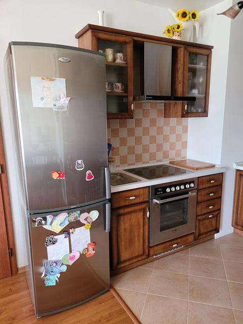 V kuchyňském koutu se nachází kuchyňská linka ve tvaru písmene U, vybavena vestavěnými spotřebiči. Okna v bytě jsou dřevěná - euro profily, opatřená venkovními roletami. Vytápění je dálkové, kalorimetr je osazen v bytě. Podlahy v chodbě, koupelně, WC a v kuchyňském koutu jsou kryté keramickou dlažbou, v obývacím pokoji a ložnici je plovoucí podlaha, v dětském pokoji je koberec. V koupelně jsou keramické obklady a dlažba, vana, umývadlo, přípojka na pračku, WC je samostatné, rovněž s keramickými obklady a dlažbou.