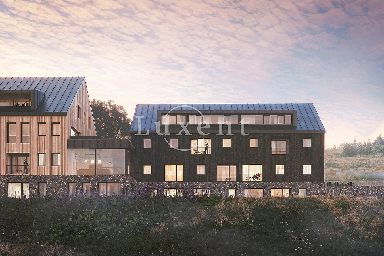 Nabízíme horský apartmán v nově vznikajícím projektu v Peci pod Sněžkou. Jedná se o novostavbu 33 apartmánů se společným zázemím na výjimečném místě ve výšce 1000 m n.m. přímo na sjezdovce Zahrádky. Můžete získat unikátní příležitosti trávit svůj čas v horách „ve svém“ a současně investovat s výnosem. Apartmány budou profesionálně spravovány se zajišťováním pronájmů a služeb (gastro, doprava, horský program apod.). To vše se formuje a vy můžete být při tom na úplném začátku a vybrat si ten nejlepší apartmán pro vás.Nabízený apartmán má dispozici 3+kk a celkovou plochu 64,7 m2 s lodžií 4,4 m2 a terasou 10 m2. Nabízí dvě ložnice s prostupem na východní terasu a obývací pokoj se vstupem na jižní lodžii, dále pak koupelnu a samostatnou toaletu. Orientace oken je na JV a SV s výhledem dolů po svahu směrem k Peci. K apartmánu náleží sklep.Budova i apartmány jsou architekty navrženy tak, aby poskytovaly komfort a pohodlí a lákaly dlouhodobě i zájemce o pronájem. Součástí společných prostor je wellness a společenská místnost prosklená do horské krajiny. Správa a pronájem apartmánů budou zajištěny ve vysoké kvalitě s osobním přístupem ve spolupráci s renomovaným místním hotelovým operátorem. Současně se jedná o apartmány s možností odpočtu DPH, takže lze tuto investici začlenit do své podnikatelské strategie.Známou horskou lokalitu Pece pod Sněžkou asi není třeba příliš představovat. V nedalekém centru Pece najdete veškerou infrastrukturu včetně restaurací, obchodů, lékaře, půjčoven sportovních potřeb, lyžařských škol a školek či místní bazén a bobovou dráhu. Můžete odsud vyrazit po celý rok na túry a výlety, přímo z apartmánů třeba na vrchol Sněžky nebo Liščí hory, k Černohorskému rašeliništi či Obřímu dolu. Doprava z Prahy je hladká, autem kolem 100 minut z Černého Mostu. Parkování a dopravu v rámci Pece pak zajistí provozovatel projektu.Předpokládaná kolaudace projektu do konce roku 2026.Bližší informace poskytne naše makléřka.