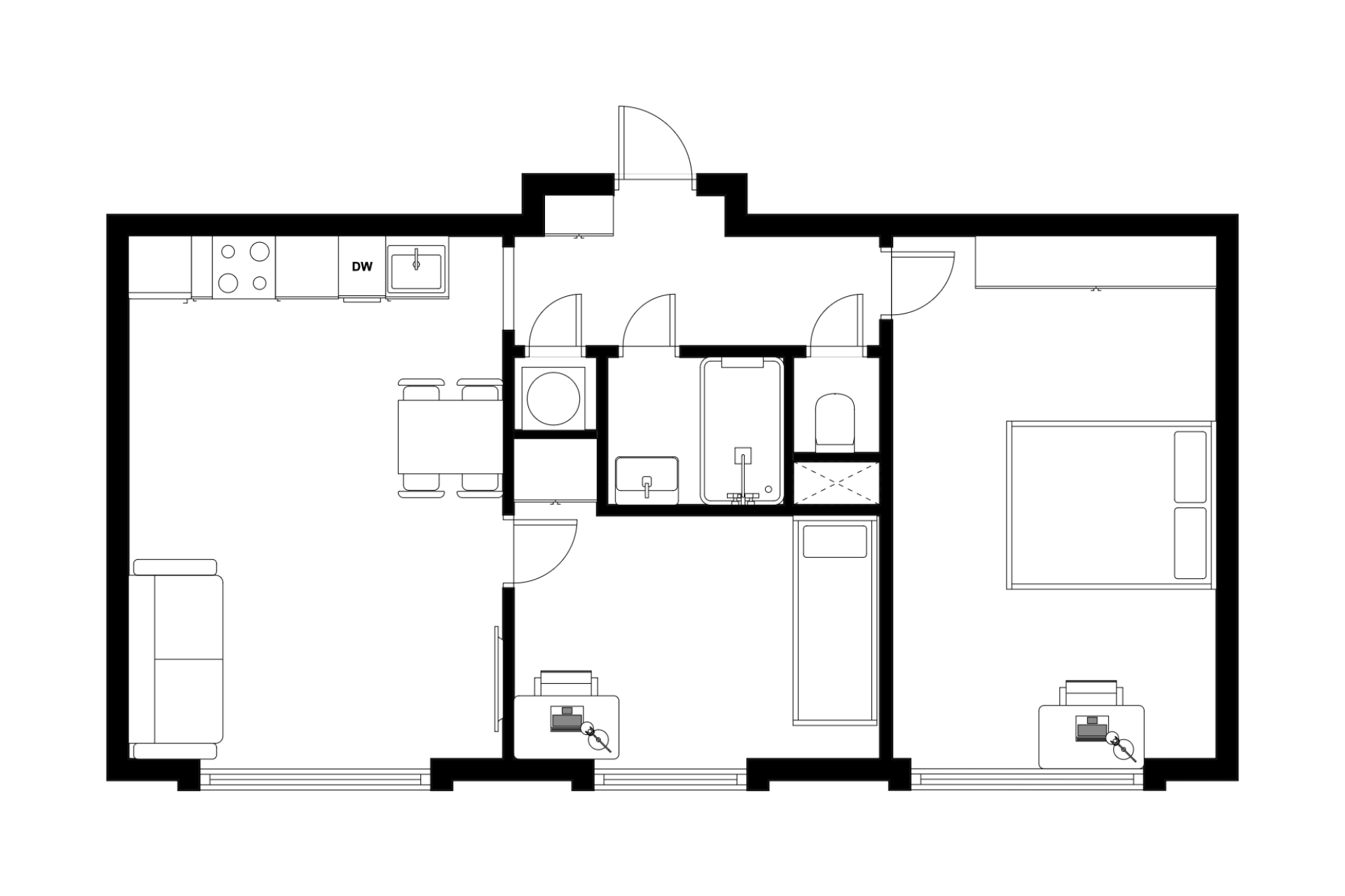 Dispozičně nabízí prostorný obývací pokoj s kuchyňským koutem, dva samostatné pokoje vhodné jako ložnice, dětský pokoj či pracovna, koupelnu se sprchovým koutem, samostatnou toaletu, prostornou vstupní chodbu a technickou místnost s místem pro vestavné skříně nebo jiné úložné řešení.