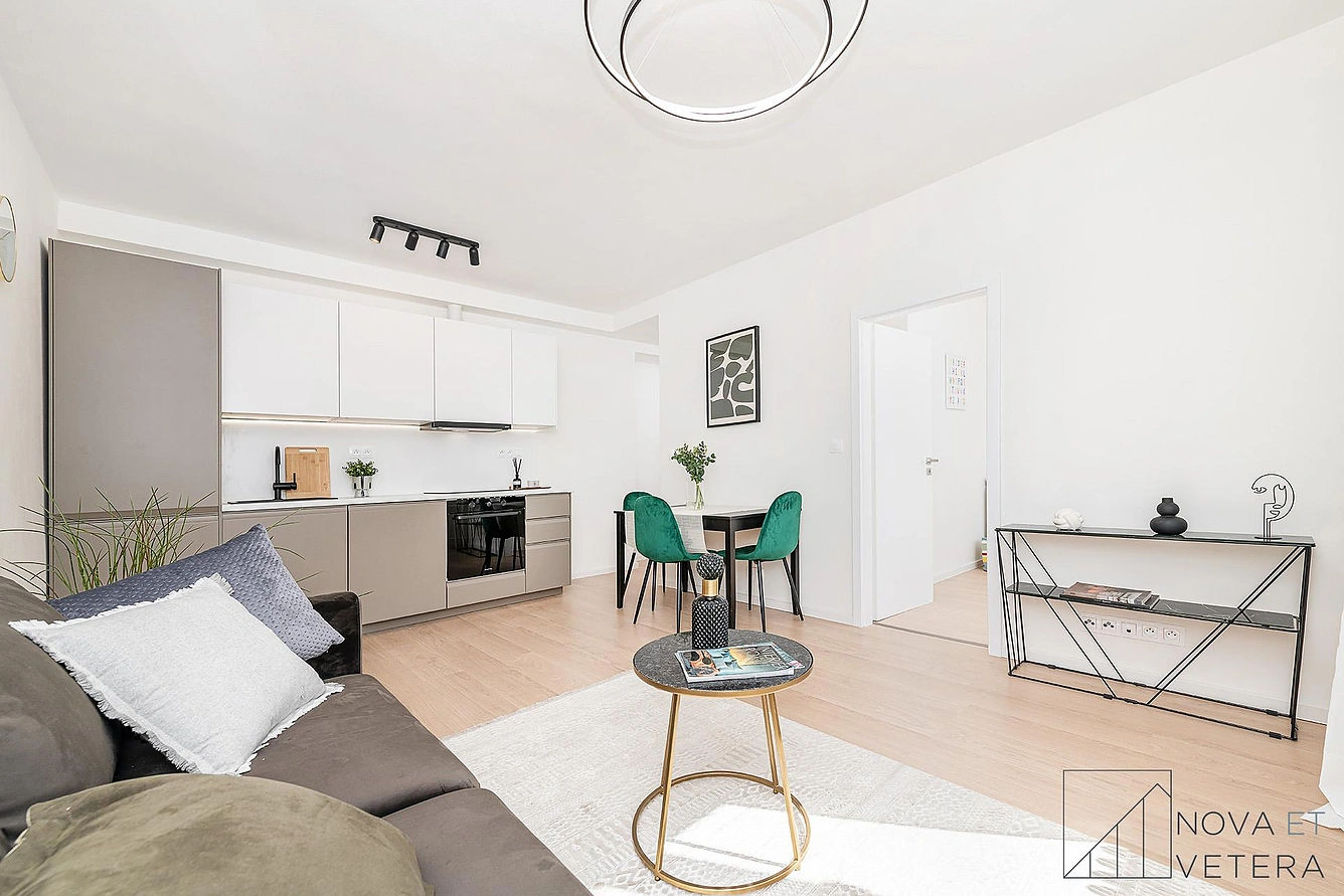 Dispozičně byt nabízí obývací pokoj s kuchyňským koutem, dva samostatné pokoje vhodné jako ložnice a dětský pokoj nebo pracovna, prostornou vstupní chodbu a moderní koupelnu s toaletou. K bytu náleží sklepní kóje o velikosti 2 m².