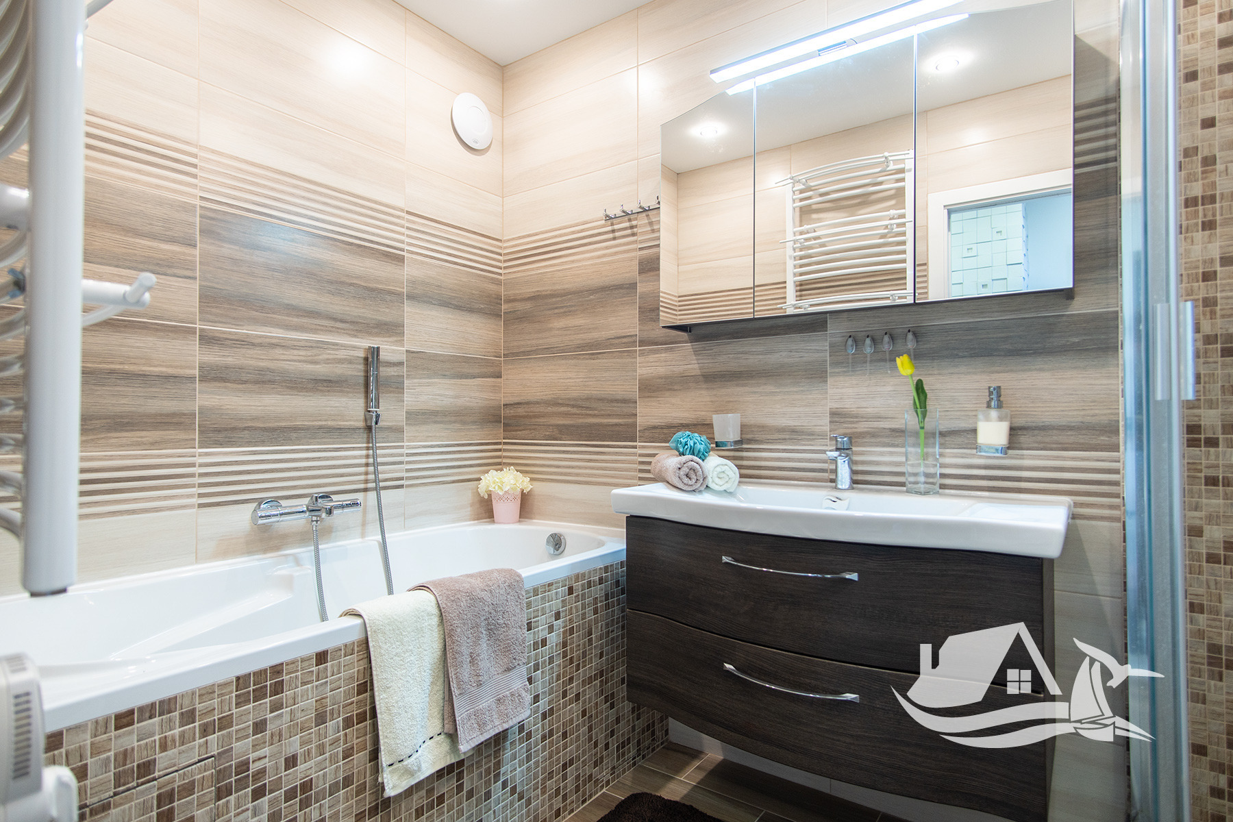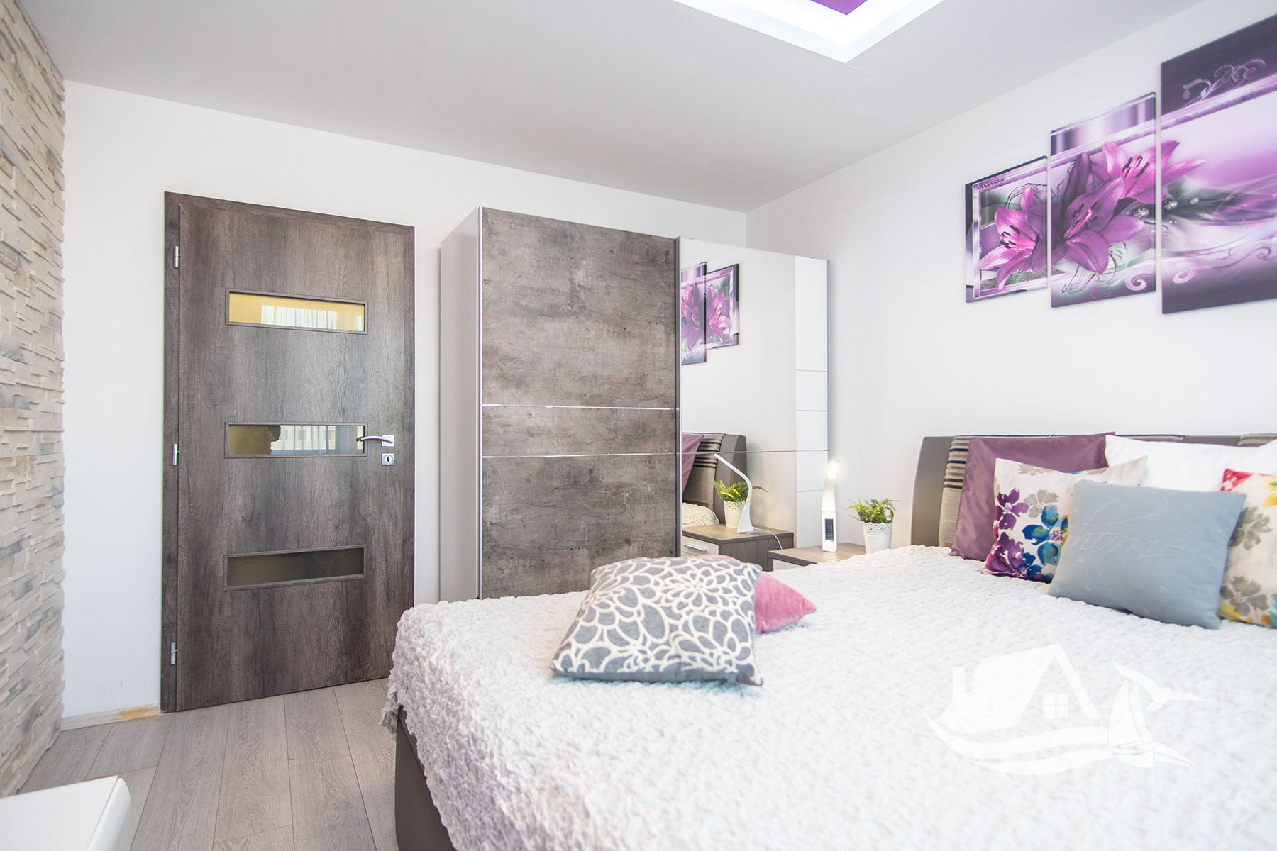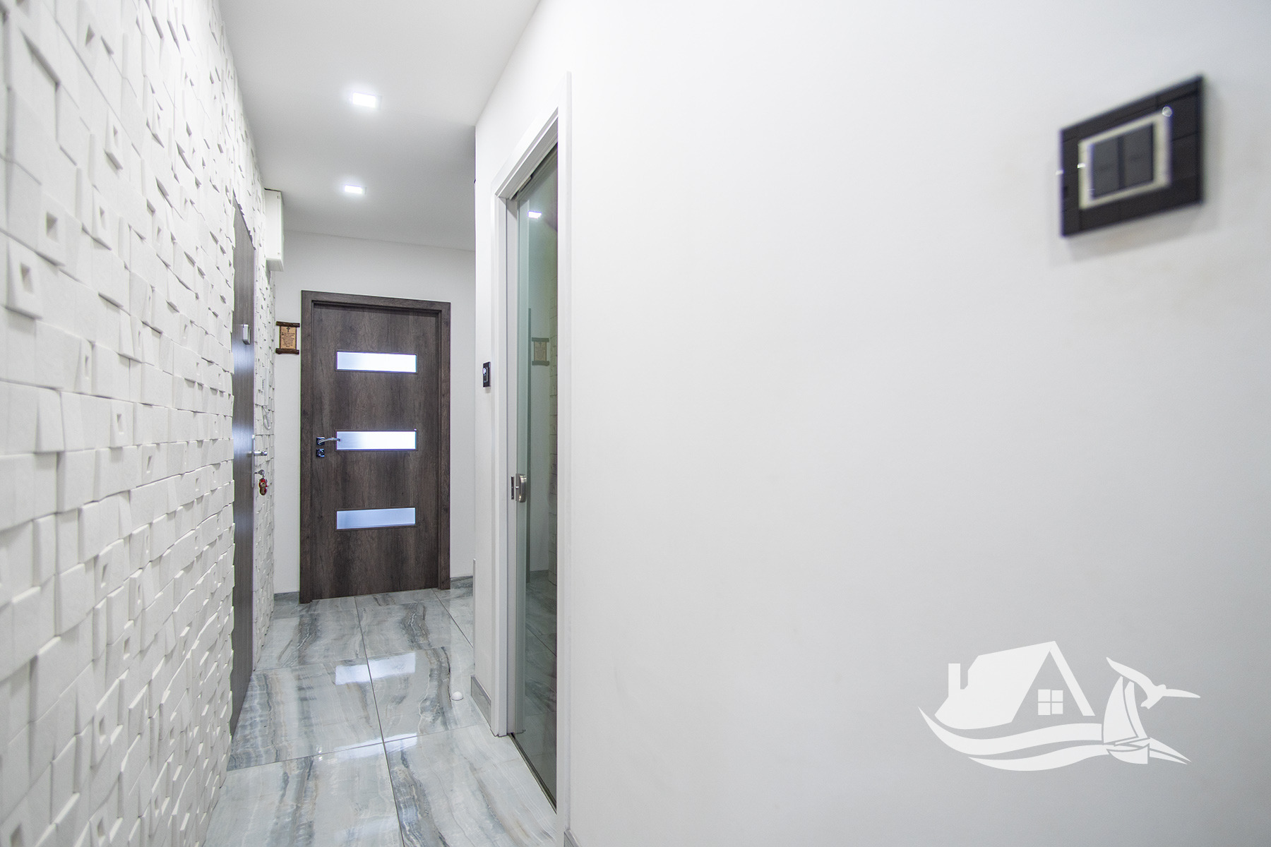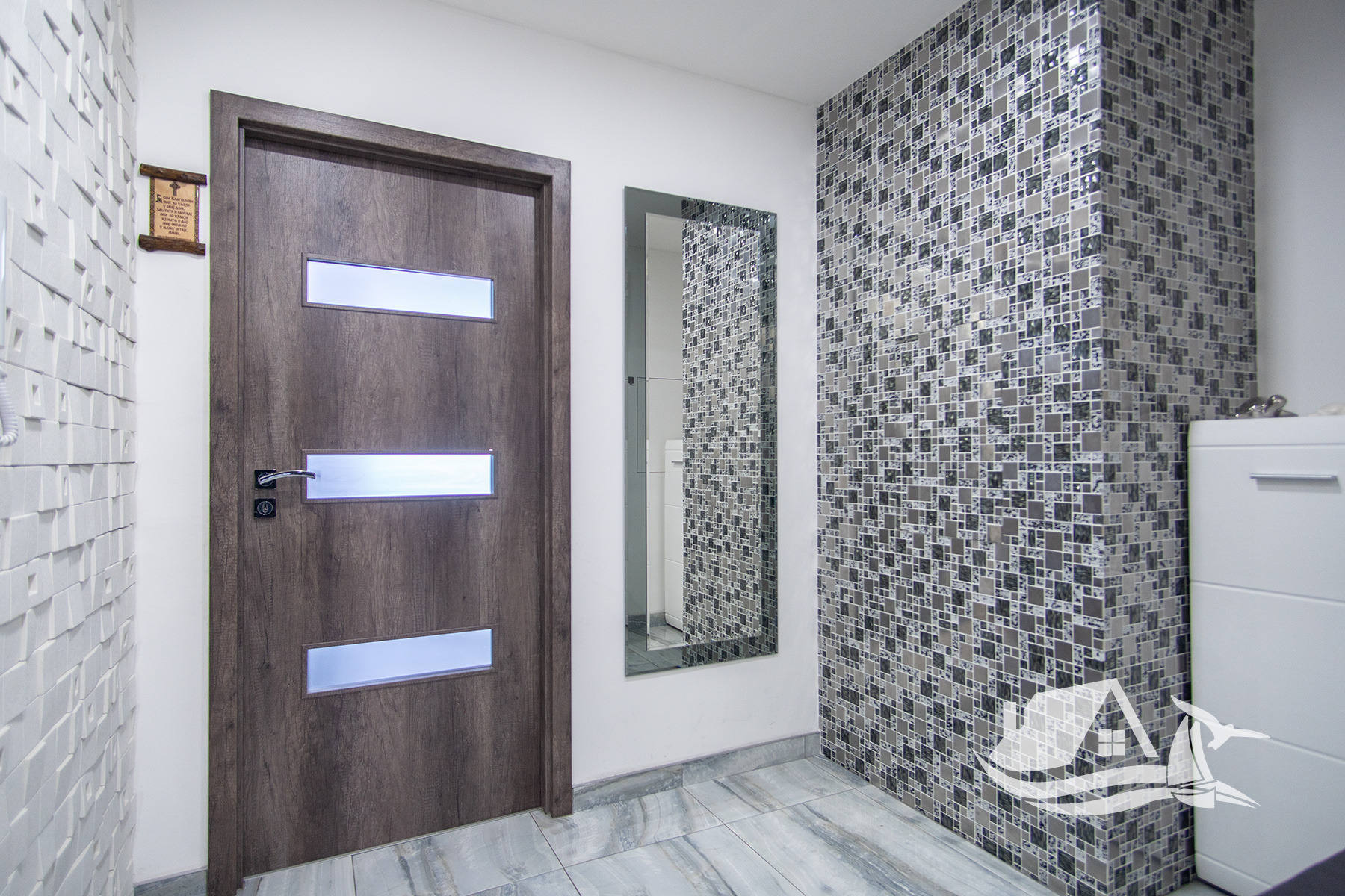 Interiér bytu je navržen s citem pro detail a odolnost materiálů, v kuchyni i koupelně najdete luxusní obklady a sanitu, v obývacím pokoji a ložnicích kvalitní vinylovou podlahu, která si zachovává vzhled dřeva a přitom vydrží každodenní provoz.