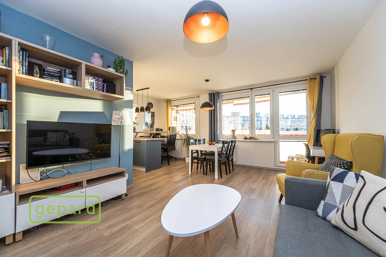 Byt zaujme promyšlenou dispozicí i příjemnou atmosférou. Dominantou je velký obývací pokoj s kuchyňským koutem (31 m²), (kuchyň Oresi Livanza z roku 2020) a přímým vstupem na slunnou lodžii s výhledem do zeleně, ideální pro ranní kávu či odpočinek po práci.