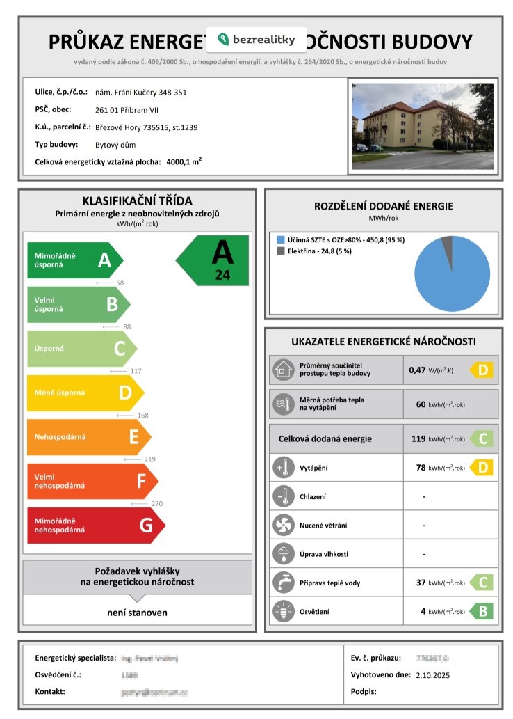 Pokud hledáte byt, ve kterém je ráno světlo jako na letní louce a přitom klid, jaký v rušnějších částech města nenajdete, máme pro vás tip.Ve třetím patře cihlového zatepleného domu nabízíme k prodeji náš světlý prostorný byt 3+kk o celkové ploše 78 m2 s balkonem orientovaným do parku a suchým zaizolovaným sklepem. Dům má novou střechu (2016), zateplené sklepy a čerstvé zateplení fasády, takže vás čekají opravdu nízké náklady na bydlení díky energetickému štítku z roku 2025, který je v nejlepší třídě A!Samotný byt prošel rekonstrukcí v roce 2008. Byt má nové měděné elektrické rozvody, plastová okna, nová topení a upravené dispozice tak, aby působil co nejprostorněji. Navíc jsou v obývacím a dětském pokoji před měsícem vybroušené a nalakované parketové podlahy, ložnici a zbytek bytu si může nový majitel vylepšit podle svých představ.V bytě zůstane kuchyňská linka se zánovními spotřebiči (sporák, trouba a myčka), takže je ihned obyvatelný. V případě zájmu je možné po dohodě přenechat i další vybavení.V docházkové vzdálenosti od bytu je areál Nový rybník, kino, divadlo, školy, školky, pošta, obchody i autobus do Prahy (vše vzdáleno cca 5 minut chůze).Pro více informací a domluvu prohlídky nás kontaktujte, rádi vám byt ukážeme osobně. V případě více zájemců si vyhrazujeme právo vybrat budoucího majitele. Cena zahrnuje veškeré poplatky, právní služby i úschovu kupní ceny. Tato nemovitost je určena výhradně přímým zájemcům o koupi. Na inzerát můžete také reagovat přímo na webu Bezrealitky: https://www.bezrealitky.cz/nemovitosti-byty-domy/947512-nabidka-prodej-bytu-namesti-frani-kucery-pribram