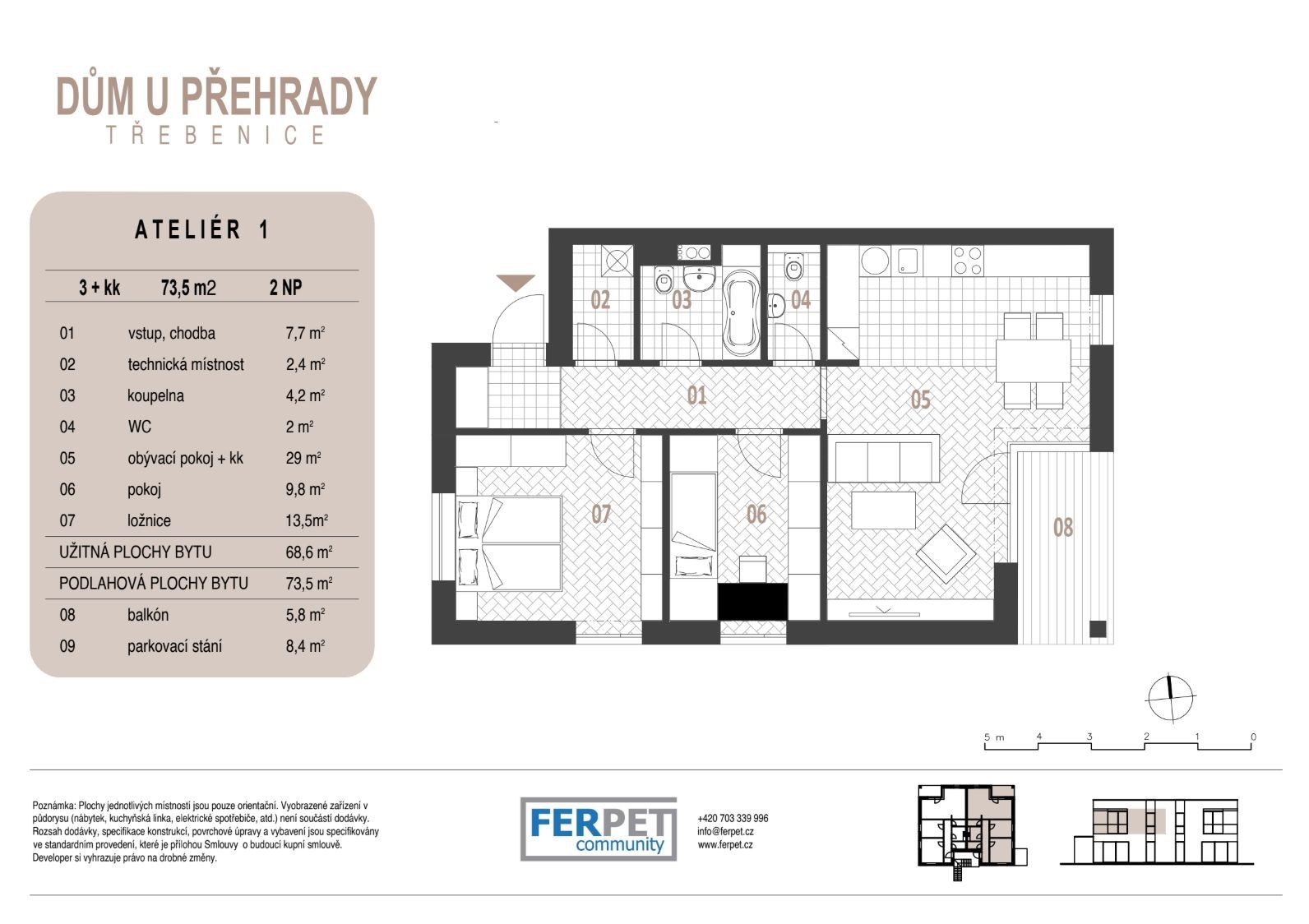 Objevte jedinečné bydlení v moderní rezidenci, kde jsou jen čtyři jednotky. Dispozice 3+kk je řešena s důrazem na praktičnost a pohodlí. Prostorný obývací pokoj s kuchyňským koutem nabízí dostatek prostoru pro rodinný život i večery s přáteli. Součástí bytu je vlastní parkovací stání a zásadní přidanou hodnotou je terasa o velikosti 5,8 m2.