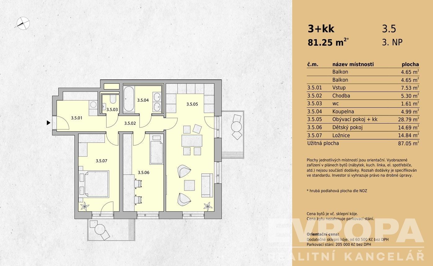 Nabízíme Vám prodej bytu 3+kk o celkové výměře 87,05 m2, včetně dvou balkónů o velikosti 4,65 m2, který se nachází v 3.NP bytového domu s názvem Rezidence Na Bradle.