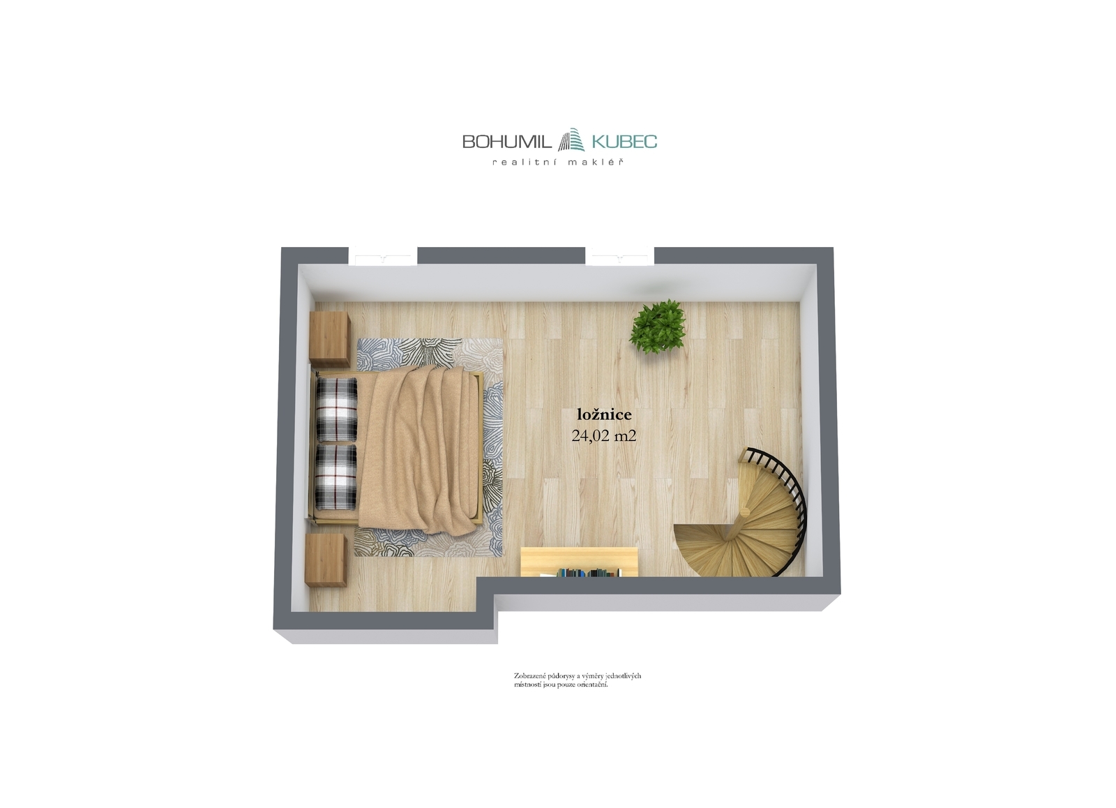 V hlavní obytné části se nachází obývací pokoj s kuchyňským koutem, dále samostatný pokoj, koupelna s toaletou a vstupní předsíň. V podkroví je umístěna ložnice.