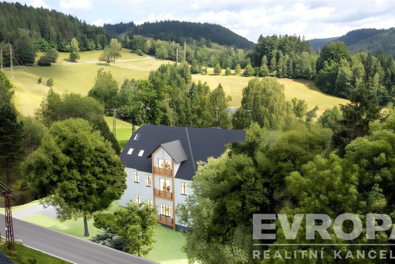 Nový horský projet, byt, apartmán 3kk 95 m2, z toho terasa 26,2m2, vlastní parkovací stání, sklepní koje, wellnes, velká zahrada, lyžárna, vlek i běžecké stopy, cyklostesky i turistické trasy.