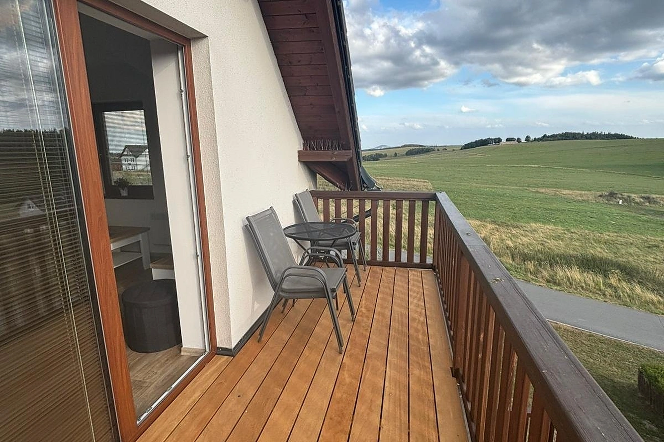 V zastoupení majitele nabízíme prostorný mezonetový horský apartmán 3+kk (88 m2 + terasa 8,5 m2) v srdci Jeseníků – v klidné části Horního Václavova. Moderní budova se čtyřmi apartmány nabízí ideální kombinaci rekreačního bydlení a investiční příležitosti.Apartmán se rozkládá ve 2. a 3. nadzemním podlaží a poskytuje komfortní zázemí až pro 8 osob.Z prostorného obývacího pokoje s plně vybavenou kuchyní vstoupíte na slunnou dřevěnou terasu s výhledem na hory. V horním podlaží se nachází útulná ložnice s dvojlůžkem a samostatným lůžkem, ve spodním podlaží pak druhá ložnice s dvojlůžkem, dvěma samostatnými lůžky a šatní skříní.Součástí apartmánu je koupelna s rohovou vanou, kvalitní podlahové materiály a nezávislé elektrické vytápění s dálkovou regulací přes GSM modul – ideální řešení pro majitele, kteří chtějí mít provozní náklady pod kontrolou i na dálku.Dům má energetickou třídu B (velmi úsporný), připojení na internet i společnou TV anténu. Samozřejmostí je vlastní vstup, parkovací stání, ¼ pozemku a ¼ společných sklepních prostor pro úschovu kol či lyží.Proč právě tento apartmán: Výnosný investiční potenciál – vysoká obsazenost díky atraktivní lokalitě Možnost vlastního užívání i krátkodobého pronájmu Zajištění správy a úklidových služeb na přání Perfektní celoroční destinace – lyžování (600 m od skiareálu Čerťák), cykloturistika, turistika i relax Nulové starosti, stabilní výnos, osobní rekreační hodnotaZ údolí pod apartmány (cca 7 minut pěšky) je přístup k cyklobusům směřujícím až pod Praděd, což zajišťuje výbornou dostupnost letních tras i zimních aktivit.Tento apartmán je vynikající investiční příležitost – ideální pro ty, kteří chtějí spojit příjemné s užitečným: mít své místo v horách a zároveň nechat nemovitost vydělávat.Kontaktujte nás a rádi vás provedeme osobní prohlídkou.