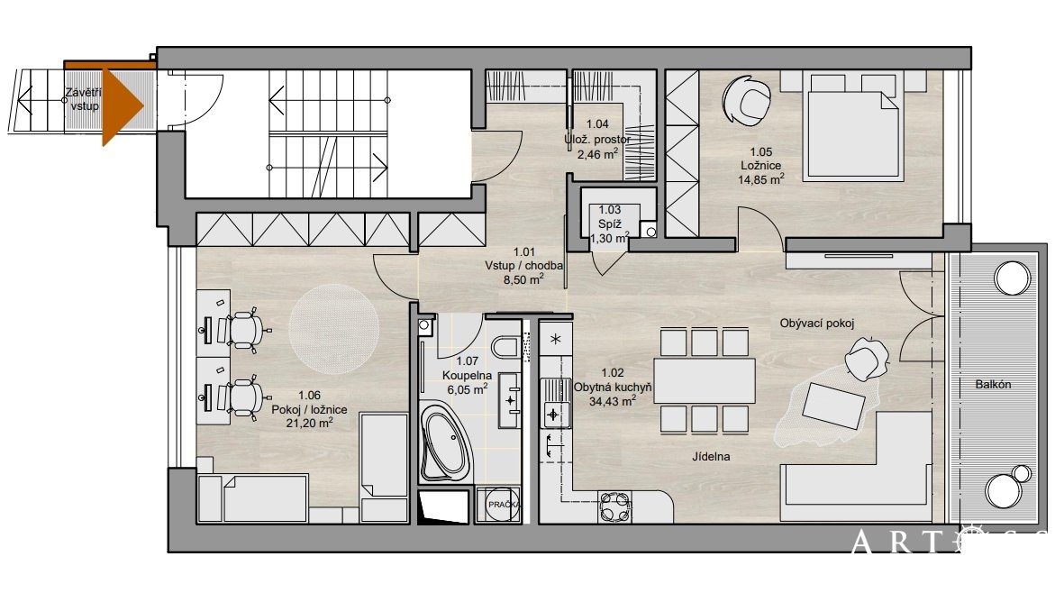 Exkluzivní novostavba bytu s balkonem a nádherným výhledem – Vavřinec u BlanskaHledáte domov, který kombinuje klid, soukromí, luxusní prostor a kvalitní stavbu?Máme pro vás jedinečnou nabídku – prostorný, slunný byt v exkluzivním viladomě v malebném Vavřinci u Blanska.Tento cihlový dům nejvyšší kvality byl postaven s maximálním důrazem na energetickou úspornost a dlouhou životnost. Všechny stropy včetně střešní konstrukce jsou monolitické železobetonové, příčkové zdivo zděné, interiérové dveře vysoké 210 cm a po celém bytě je komfortní podlahové vytápění.Dominantou bytu je obývací pokoj s kuchyňským koutem o rozloze 34,4 m2 s přímým vstupem na balkon (6,7 m2), odkud vás okouzlí nerušený výhled na okolní louky a lesy. Byt je navržen tak, aby poskytoval maximální ergonomii a prostor – nechybí ani samostatná zděná spíž v kuchyni a prostorná šatna u vstupu.Součástí prodeje je vlastní parkovací stání a sklepní kóje v suterénu domu.Viladům je koncipován s ohledem na absolutní soukromí – každý byt má promyšlené umístění, aby byl klid a maximální komfort .Dispozice bytu:Obývací pokoj s jídelnou: 34,43 m2Ložnice: 14,85 m2Pokoj: 21,20 m2Koupelna: 6,05 m2Chodba: 8,50 m2Spíž: 1,30 m2Balkon: 6,7 m2Sklep: 4,60 m2Užitná plocha bez balkonu a sklepa: 89 m2Lokalita:Vavřinec nabízí přímé autobusové spojení do Blanska a kouzlo bydlení v přírodě, přesto s dobrou dostupností města.Aktuálně pracujeme na dokončení bytů, předpokládaný termín kolaudace je koncem tohoto roku. Cena je za dokončený, zkolaudovaný byt bez kuchyňské linky. Dopřejte si domov, který má vše, doporučuji osobní prohlídku.Na konci fotogalerie průběh stavby.