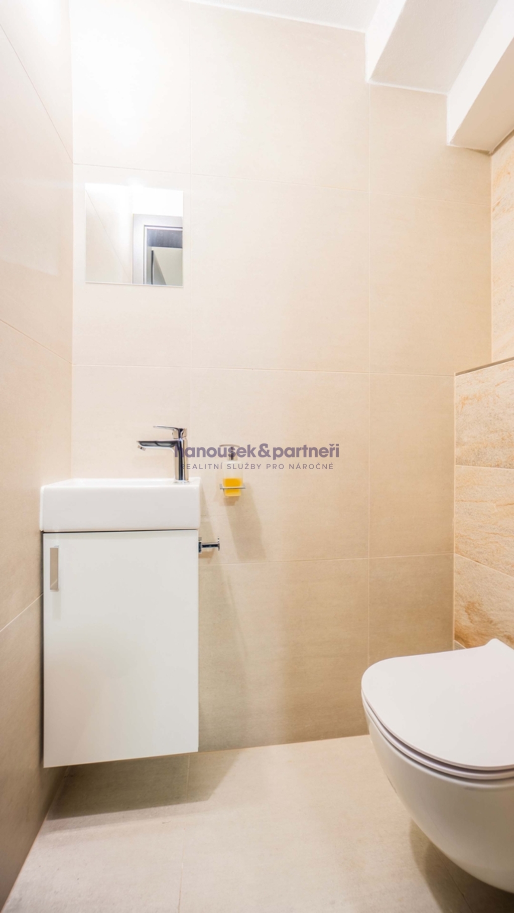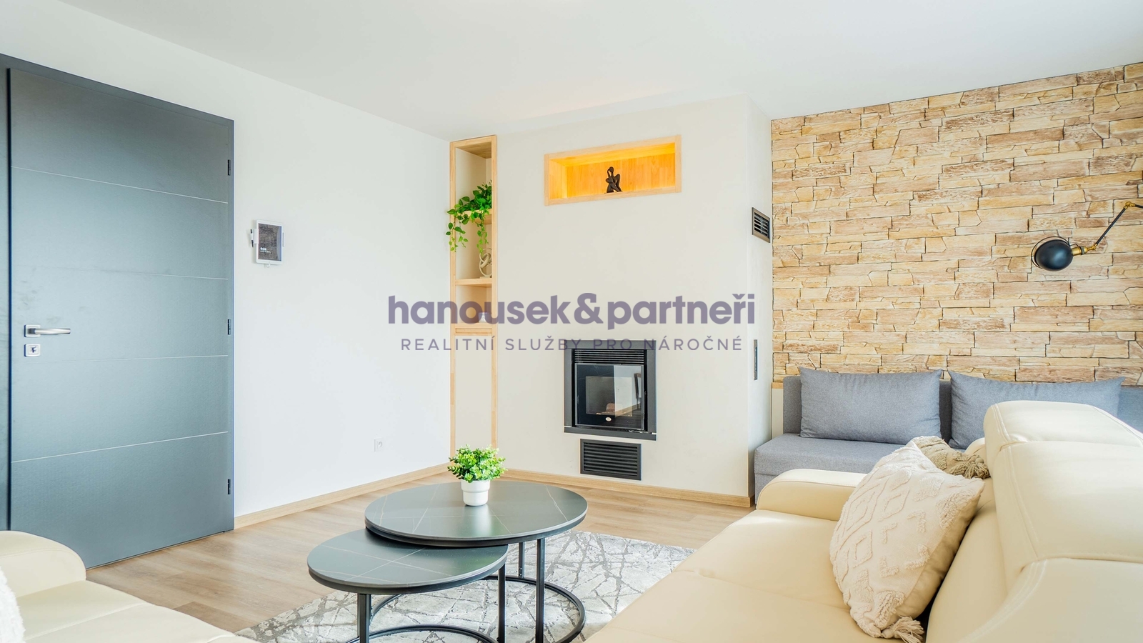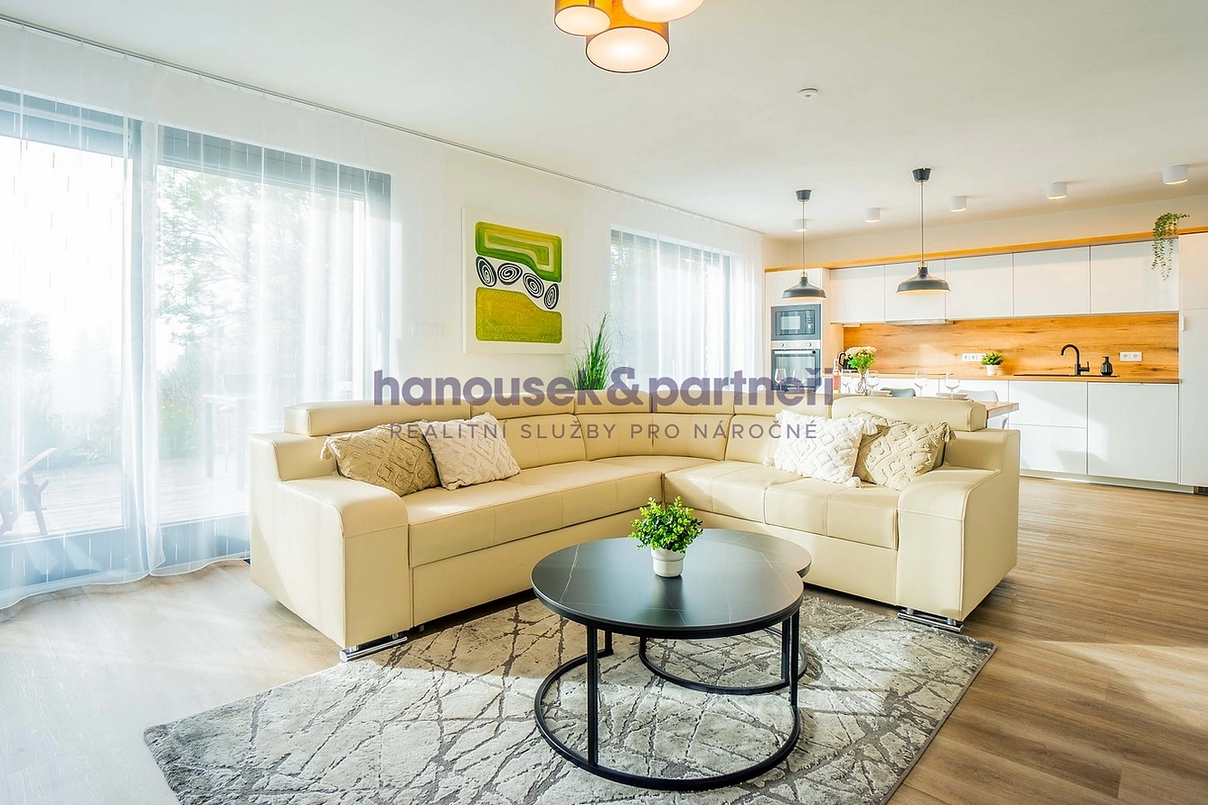 Apartmán je jedním ze dvou bytů v cihlové rodinné novostavbě. Má dispozici 3+kk a celkovou výměru 119 m2. V přízemí je obývací pokoj s kuchyní a vstupem na terasu, pracovna a samostatné WC. V patře jsou dvě ložnice a dvě koupelny.