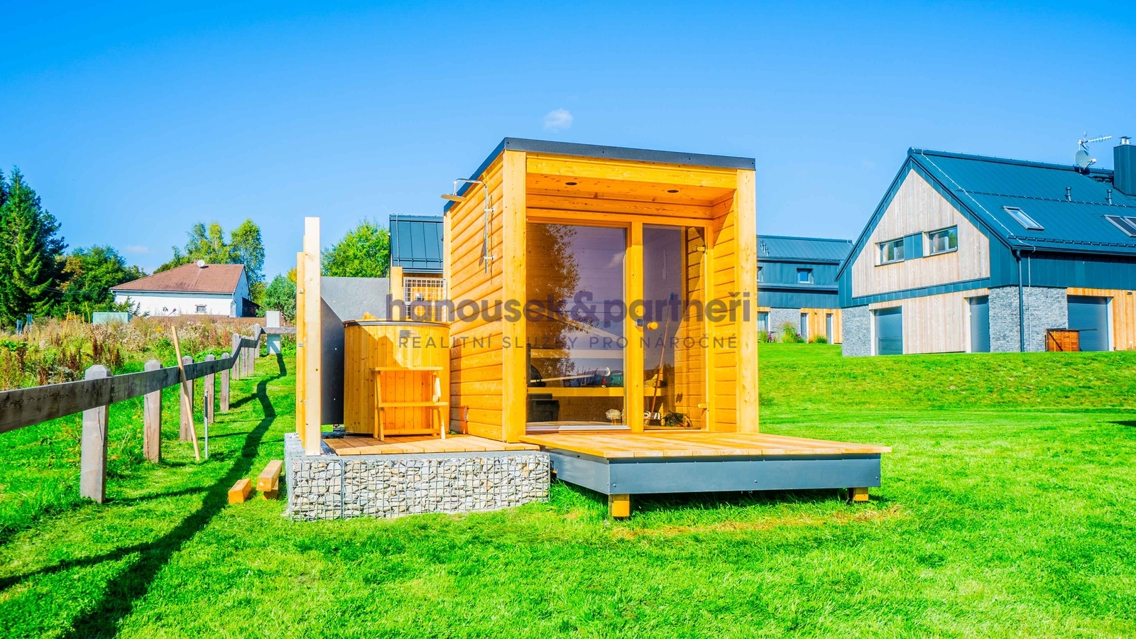 Z té je krásný výhled do šumavské přírody i na zahradu. Po výletě nebo lyžovačce nic nepřijde vhod víc, než pobyt v prosklené sauně s ochlazovací kádí.