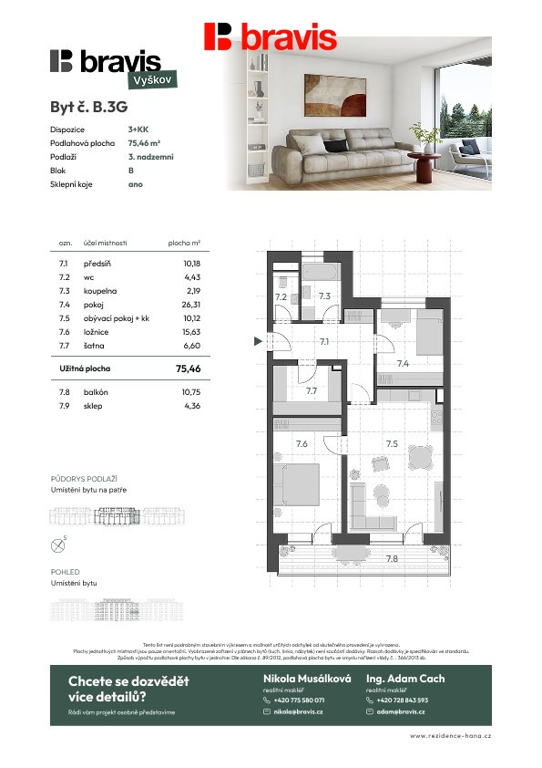 PRODEJ NOVÝCH BYTŮ VE VYŠKOVĚ ZAHÁJEN!Rezidence Haná otevírá své dveře – moderní projekt, který spojuje komfortní bydlení s klidnou lokalitou a skvělou dostupností.Nabízíme byt B.2G – 3+kk, 75,46 m2, umístěný ve 2. nadzemním podlaží. Díky praktické dispozici a balkonu o velikosti 10,75 m2 je ideální pro rodinné bydlení i jako výhodná investice. Součástí ceny je také sklepní kóje (4,36 m2).Dispozice bytuPředsíň (10,18 m2) – dostatek prostoru pro vestavěné skříněWC (2,19 m2)Koupelna (4,43 m2) – moderní a prakticky řešenáPokoj (10,12 m2) – vhodný jako dětský nebo pracovníObývací pokoj s kuchyní (26,31 m2) – světlý, vzdušný, s přímým vstupem na balkonLožnice (15,63 m2) – klidné místo pro odpočinekŠatna (6,60 m2)Balkon (10,75 m2) – ideální pro relaxaci či posezení s přáteliSklep (4,36 m2) – prostor pro sportovní vybavení a sezónní věciVýhody projektu Rezidence HanáEnergeticky úsporná novostavba ve vysokém standarduBude vybudované velkokapacitní veřejné parkoviště u domuKaždý byt má balkon nebo terasuKlidná lokalita Předměstí s pěší dostupností centraPlná občanská vybavenost – školy, školky, obchody, restaurace, lékařiSkvělá dopravní dostupnost – MHD, dálnice D1, Brno jen 20 minutRezidence Haná – váš nový domovProjekt zahrnuje 35 bytových jednotek, což zaručuje příjemné sousedské prostředí a dostatek soukromí. Moderní architektura, kvalitní materiály a chytré dispoziční řešení činí z Rezidence Haná jedinečné místo pro život i investici.Neváhejte a vyberte si své bydlení ve Vyškově právě teď!