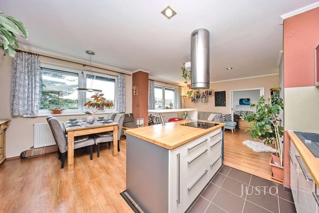 V bytě je předsíň s vestavěnými skříněmi a vstupem přímo do obývacího pokoje s kuchyňským koutem. Kuchyňský kout je z roku 2011, kompletně nově vybudovaný a má samostatný vařidlový ostrůvek. V ostrůvku je zabudovaná indukční varná deska, desingová digestoř s odtahem přímo do komínu a úložný prostor pro využití u vaření. Ze strany od jídelny lze ostrůvek využít jako bar, třeba pro návštěvy a být tak v kontaktu s přáteli i v době, kdy jim chystáte pohoštění.