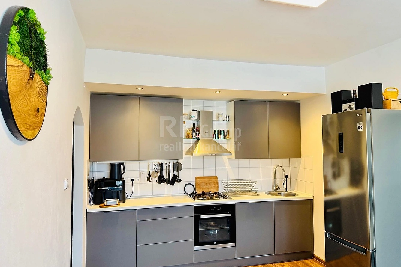 Byt je situován do třetího patra udržovaného cihlového domu. Celková podlahová plocha bytu je 105 m2 a náleží k němu dva sklepy, každý o výměře 10 m2. Rozměry jednotlivých místností: kuchyň 16,5 m2, pokoj 18,4 m2, pokoj 23,6 m2, pokoj 19 m2, pokoj 8,8 m2, předsíň 14 m2, koupelna 5 m2, WC 1,5 m2, spíž 1,5 m2, sklep 10 m2, sklep 10 m2. K dispozici je dále společná garáž. Byt prošel kompletní a nákladnou rekonstrukcí: plastová okna, nová elektroinstalace, v celém bytě jsou nové podlahy: v kuchyni, obytných místnostech a na chodbě jsou kvalitní plovoucí podlahy, v koupelně, na wc a ve špajzu je keramická dlažba, renovované vnitřní dveře, kuchyňská linka na míru, která je vybavena vestavnou myčkou, troubou a plynovou varnou deskou s digestoří, hlavní i dekorační osvětlení, venkovní rolety, vestavné skříně na míru.Vytápění bytu zajišťuje plynový kotel a klimatizace, která samozřejmě udržuje i optimální teplotu v letních měsících. Bytový dům je v dobrém technickém stavu.Veškerá občanská vybavenost se nachází v docházkové vzdálenosti. V případě zájmu o podrobnější informace k této nabídce, popřípadě o sjednání prohlídky mě neváhejte kontaktovat.