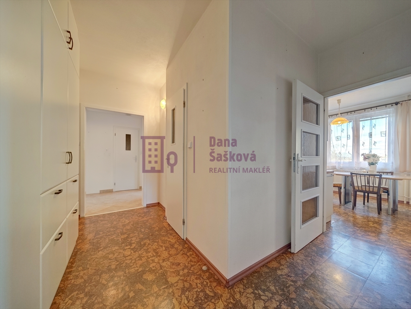 Dispozice 4+1 o celkové výměře 87 m2 nabízí předsíň, chodbu s vestavěnými šatními skříněmi, obývací pokoj se vstupem na balkon, kuchyni s jídelním koutem, koupelnu s vanou i sprchovým koutem, samostatnou toaletu s místem na pračku, dvě ložnice a pokoj s šatními skříněmi využívaný jako šatna.