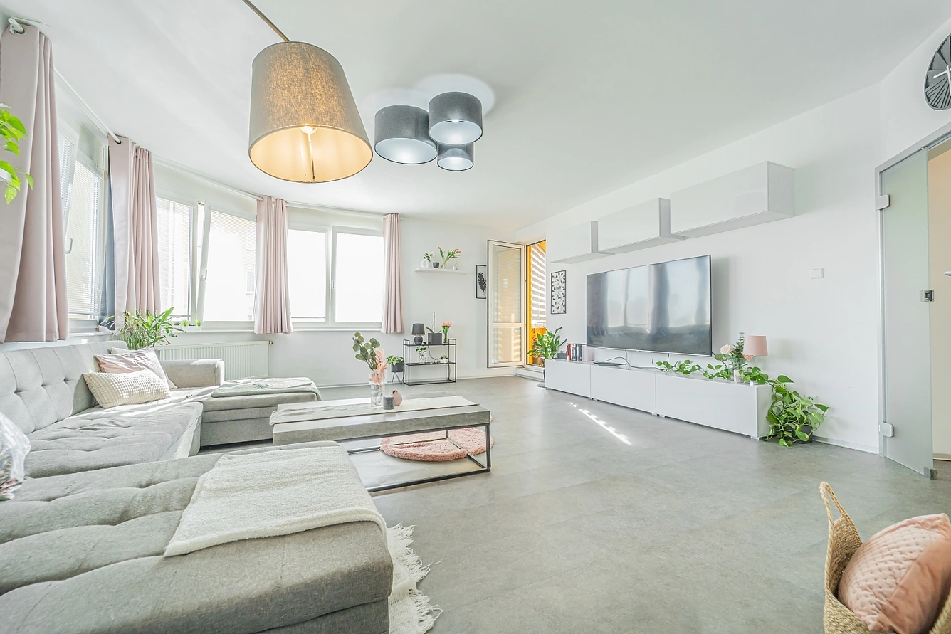 Srdcem bytu je krásný, prostorný a světlý obývací pokoj, propojený s novou kuchyní, kde je dostatek místa i pro jídelní stůl. Dvě ložnice budou určitě velmi dobře sloužit mladším členům rodiny. Ze všech zmiňovaných místností je vstup na hezkou, zasklenou lodžii. Ta může díky své výměře převážnou část roku sloužit jako další obytná místnost. Velkým bonusem je ještě jedna ložnice s vlastní toaletou a koupelnou, kde mohou například rodiče mít maximální klid a soukromí. Pro další členy rodiny je k dispozici hlavní koupelna s WC a bidetem. Velkou výhodou je dostatečně velká hala, kde máte dost místa na velkou šatní skříň. Dalším praktickým doplňkem je i komora na všechny věci, které chcete mít po ruce, ale nemusí být vidět.