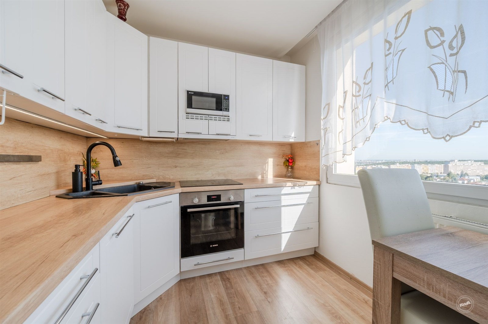 Byt má celkovou užitnou plochu 82 m2 a obytnou plochu 76 m2. Nemovitost je umístěna v 10. patře zrevitalizovaného bytového domu a nabízí krásné výhledy na město. Byt je částečně zařízený, což novým majitelům umožní okamžitě se usadit bez nutnosti dalších velkých investic do vybavení. Byt nabízí 4 samostatné místnosti, kompletně zařízenou kuchyni s rozsáhlou škálou domácích spotřebičů, včetně vestavěné elektrické trouby, varné desky, myčky, odsavače par, mikrovlnné trouby a samostatně stojící lednice, což usnadňuje každodenní život. Obývací pokoj a ložnice jsou vybaveny klimatizací, koupelna se sprchovým koutem a WC.