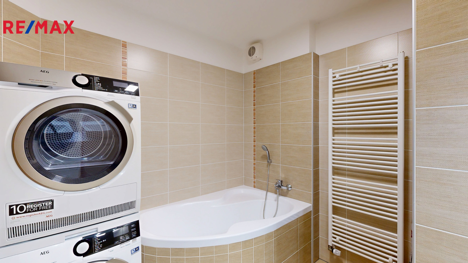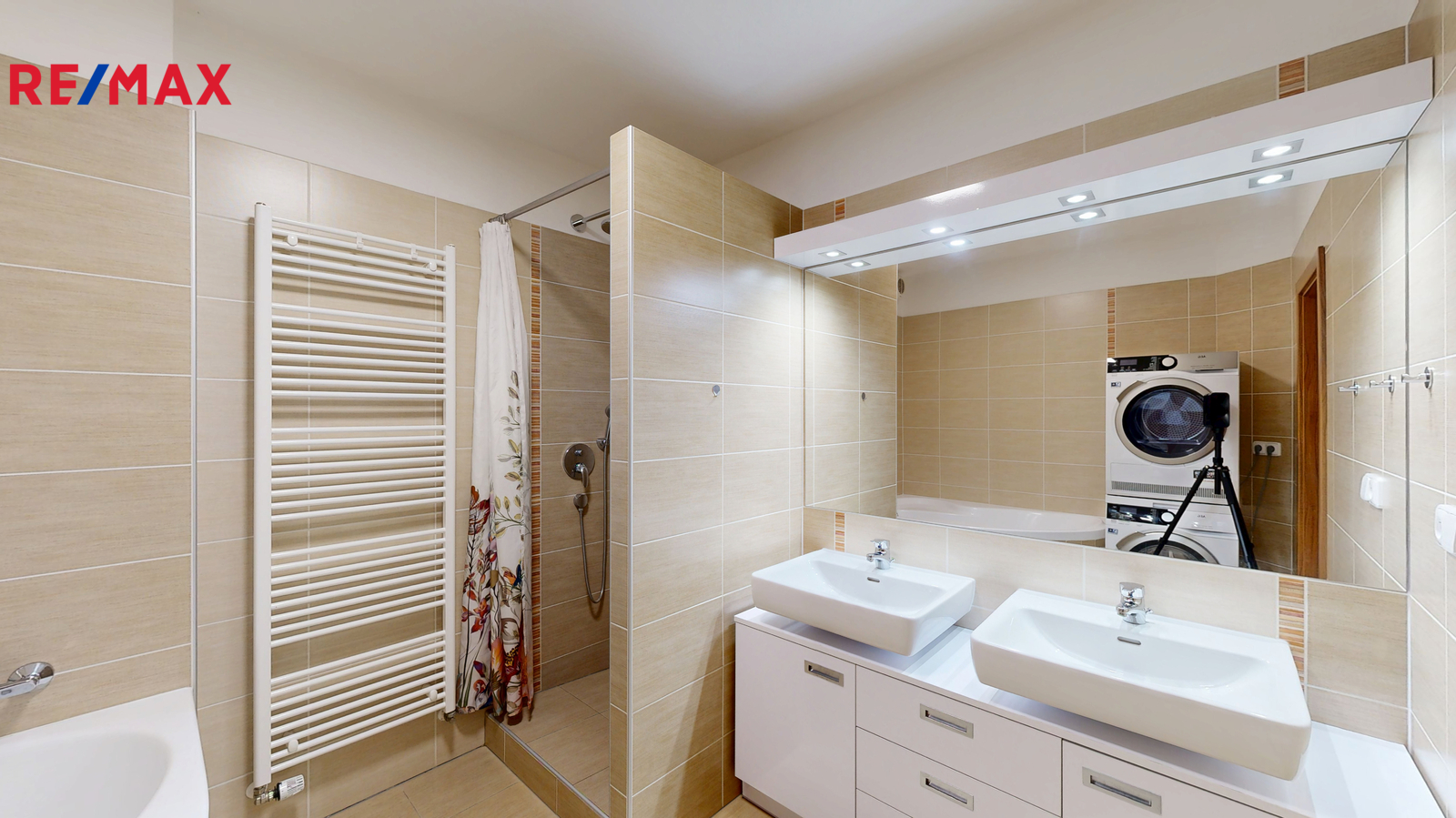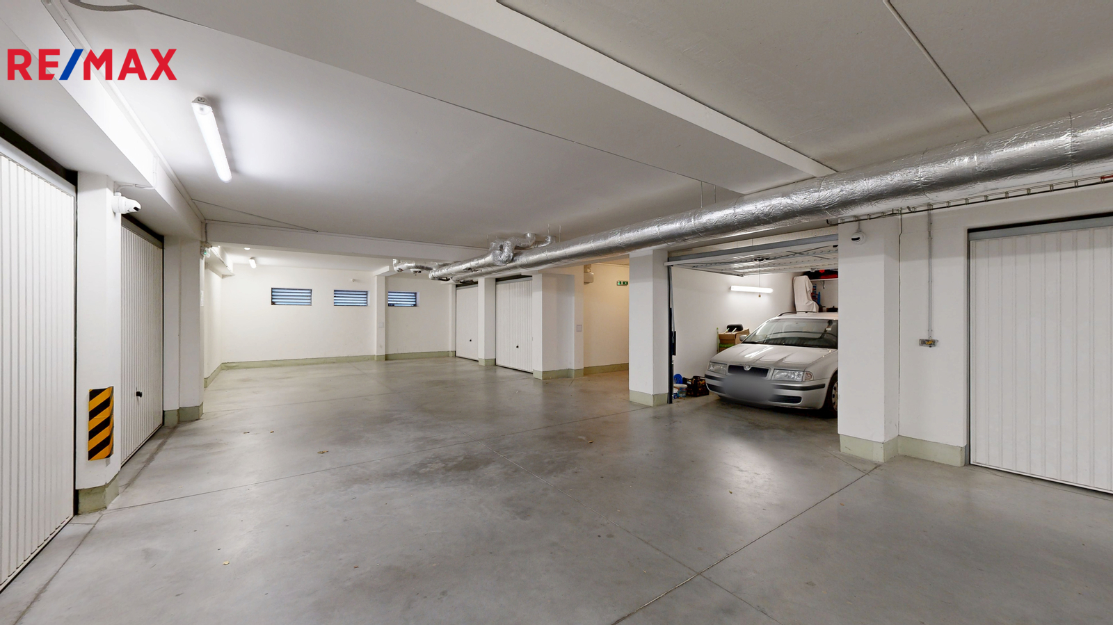 Dále k bytu náleží sklepní kóje o výměře 3 m2 a uzavřená garáž v 1.PP bytového domu o velikosti 18 m2. Garáž je situavaná v těsné blízkosti výtahu. Má výsuvná vrata značky Hormann, na dálkové ovládání.
