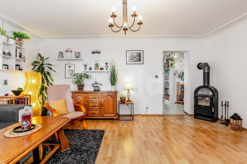 Byt zahrnuje obývací pokoj, ložnici, pokoj, kuchyni s jídelnou, chodbu a koupelnu. Výměra bytu s balkonem činí cca 81 m2. K bytu patří garáž v zahradě o výměře 22 m2.