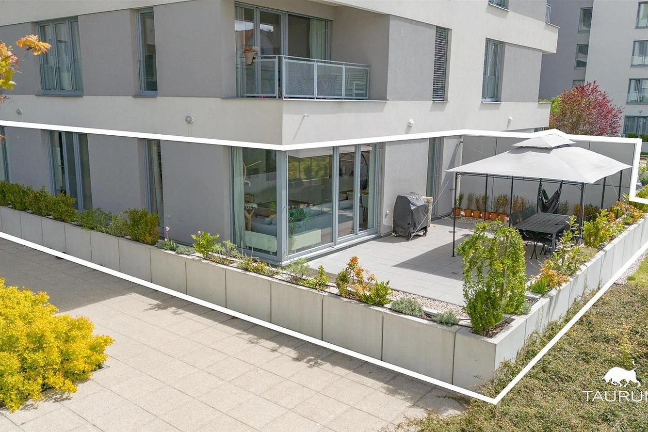 Byt se nachází v přízemí nového bytového komplexu doslova pár metrů od Chodského náměstí. Velkou předností je opravdu velká terasa (67 m2), která je přístupná z každé místnosti. Oceníte i garážové stání, kde si dveře rozhodně neodřete. Je totiž širší než standardní garážová místa.