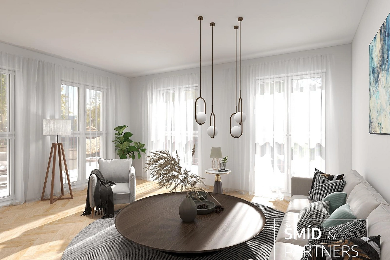 Byt se nachází ve 3. NP funkcionalistické vily z 30. let 20. století, kde právě probíhá výstavba celkem 5 bytů o dispozici 1+kk až 4+kk.