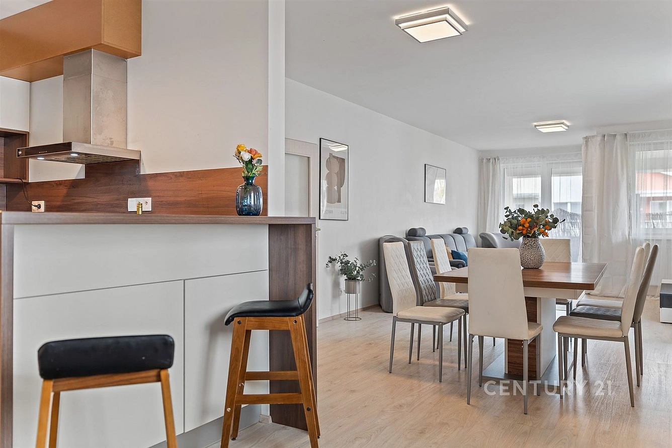 V moderní a klidné části Prahy – Letňanech – se nachází výjimečný byt 4+kk o rozloze 127,8 m2 s balkonem a lodžií, který spojuje elegantní design, kvalitní zpracování a útulnou atmosféru skutečného domova. Už při vstupu vás přivítá světlý a prostorný interiér s promyšleným dispozičním řešením, které nabízí dokonalou rovnováhu mezi společenským a soukromým prostorem. Dominantou bytu je velkorysý obývací pokoj s kuchyňským koutem a jídelní částí, tvořící přirozené centrum celého domova – ideální místo pro rodinné chvíle, setkání s přáteli i klidný odpočinek po náročném dni. Moderní kuchyně je vybavena kvalitními vestavěnými spotřebiči a nabízí dostatek úložného i pracovního prostoru.