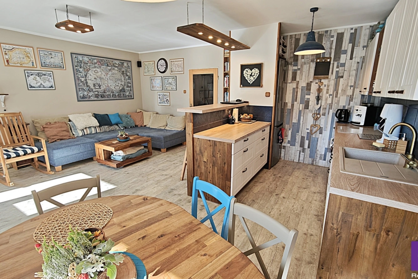 Dispozice nabízí prostorný obývací pokoj s moderně zařízenou kuchyní a jídelním koutem, 3 pokoje, koupelnu s WC, předsíň, komoru a lodžii .