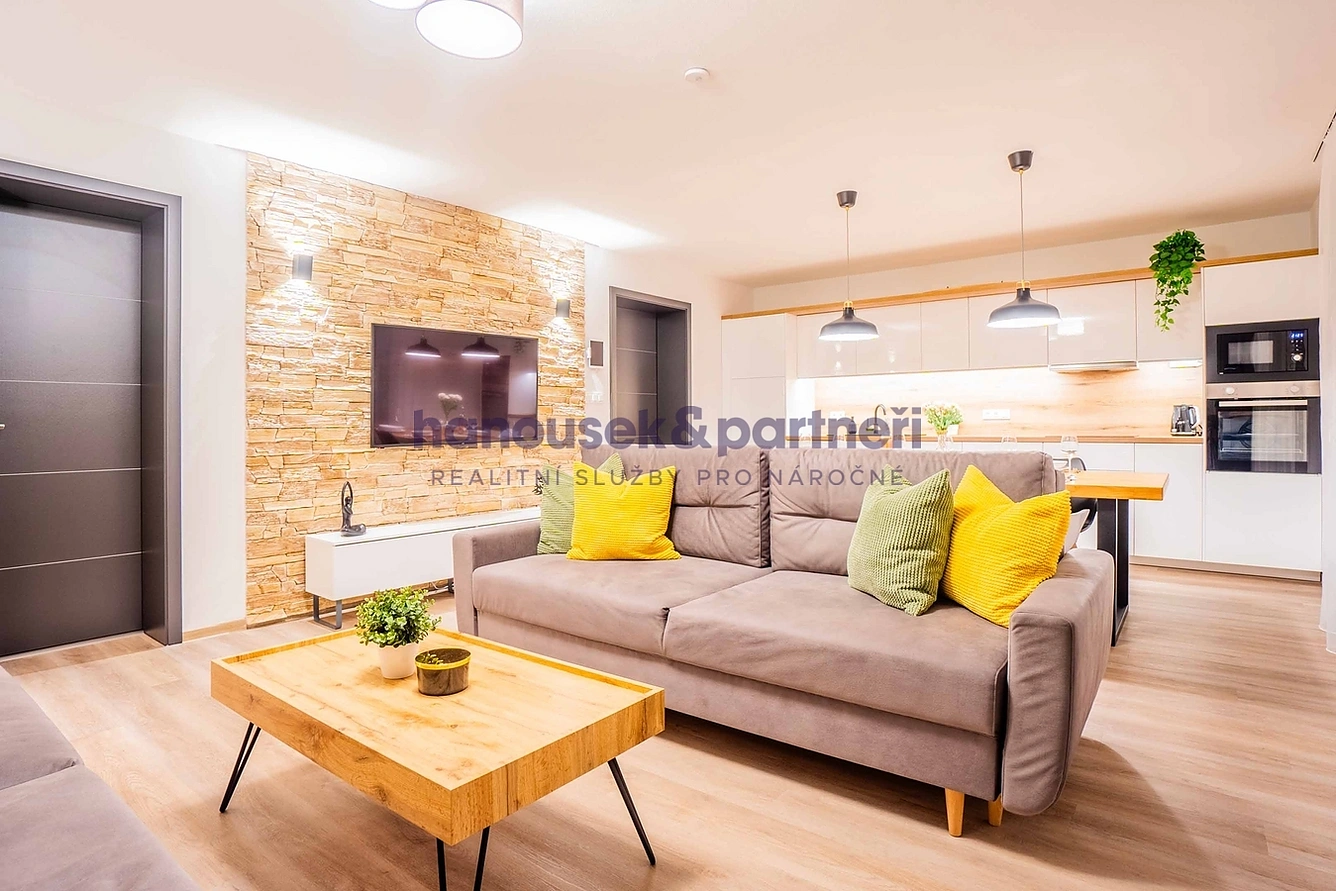 Apartmán je jedním ze dvou bytů v cihlové rodinné novostavbě. Má dispozici 4+kk a celkovou výměru 111 m2. V přízemí je obývací pokoj s kuchyní a vstupem na terasu, koupelna a samostatné WC. V patře jsou tři ložnice a koupelna.