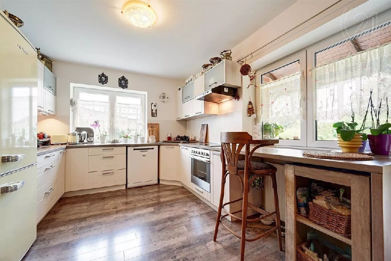 Exkluzivně nabízíme na prodej bytovou jednotku o dispozici 5+kk se zahrádkou v ulici Chmelová v Hlubočince. Bytová jednotka se nachází v bytovém domě o 2 bytových jednotkách, postaveném z kvalitních cihel Porotherm. Dům je navíc zateplen. V přízemí bytové jednotky se nachází předsíň, technickou místnost, koupelnu s WC, pokoj pro hosty, velký obývací pokoj propojený s kuchyňským koutem a výstupem na jižně orientovanou terasu, na kterou navazuje pěstěná a rovinatá zahrada. V patře se nacházejí 2 samostatné ložnice a další prostorný pokoj a druhá koupelna. Byt je skvěle udržovaný a můžete se do něj po koupi ihned nastěhovat bez dalších úprav. Dům je napojen na obecní vodovod a kanalizaci, vytápění je vyřešeno elektrokotlem Protherm. V obývacím pokoji si navíc můžete zatopit v krbových kamnech. Náklady na provoz jsou velmi nízké, necelé 3 tisíce Kč měsíčně, včetně vody a elektřiny. Je zde také jímka na dešťovou vodu. Na pozemku pohodlně zaparkujete až 3 osobní auta. V obci je restaurace, sportovní hala, hned za hranicí obce Lidl, další obchody najdeme v nedaleké Jesenici nebo Kamenici. Autem se do Prahy dostanete za 15 min, pravidelné spojení PID na metro C Budějovická. Doporučujeme prohlídku.