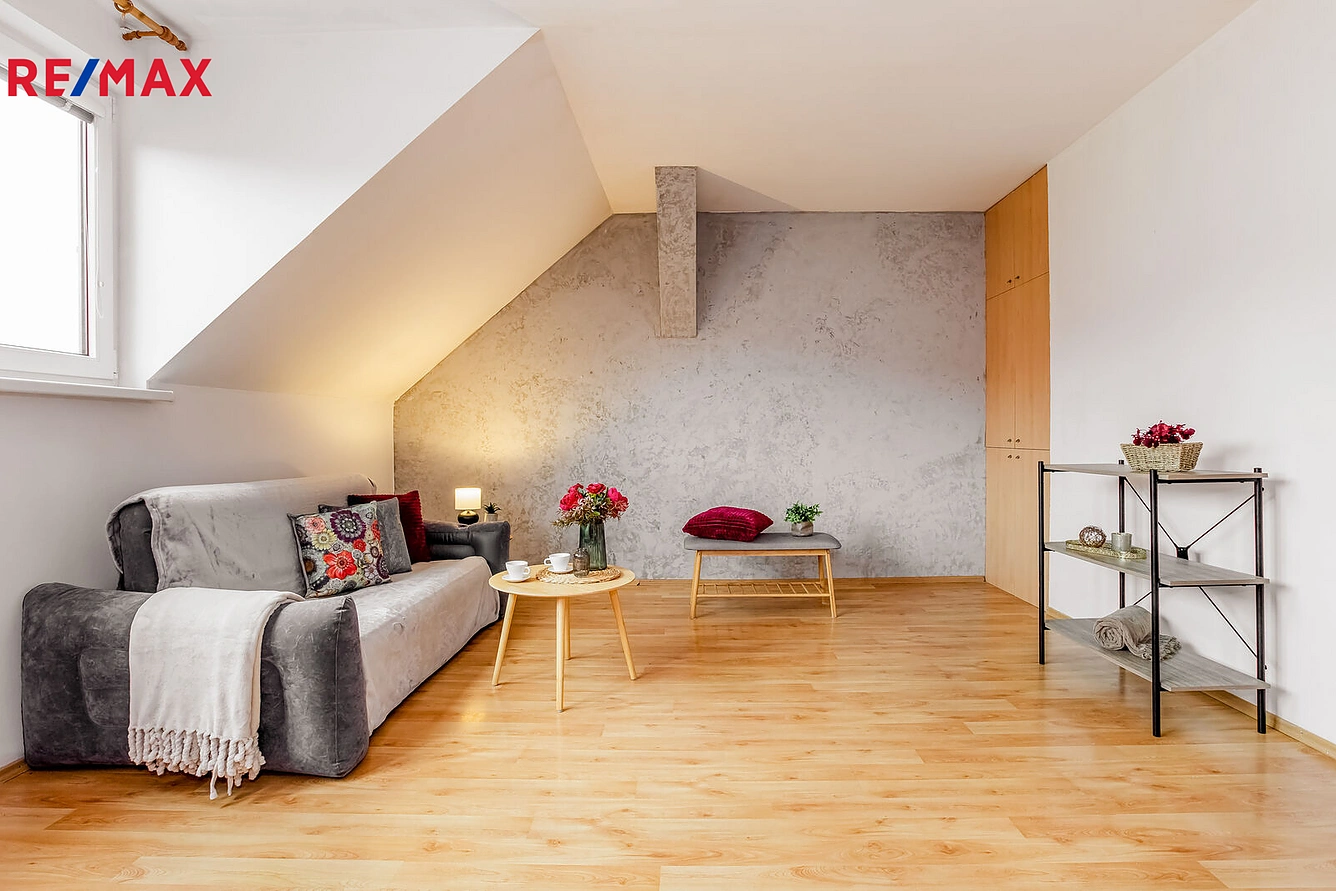 Tento atypický byt s lodžií a zahradou nabízí široké možnosti pro realizaci vlastních představ o bydlení. Kouzelnou atmosféru vytvářejí velká okna, odhalené trámy a podkrovní pokoj, který prostoru dodává jedinečný charakter.