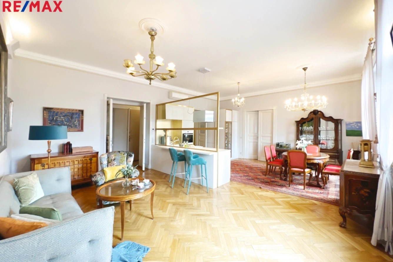 Byt nabízí dostatek úložného prostoru, vestavěné skříně a je připraven k okamžitému užívání. Každý den zde začíná jinak – ale vždy krásně. Obývací pokoj náramně spojuje historický půvab s moderním komfortem.