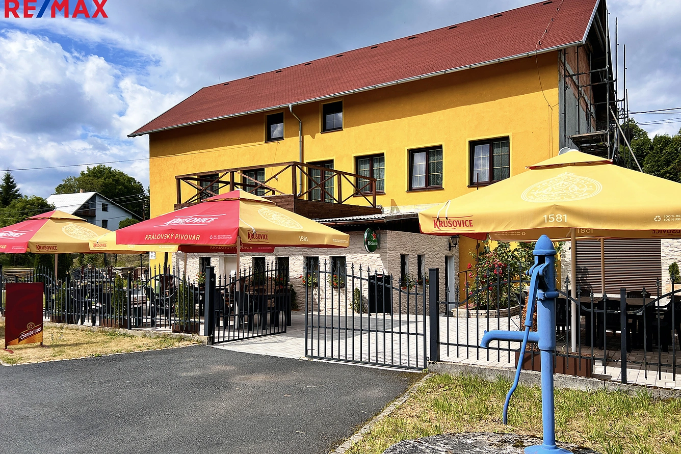 Před domem je vybudovaní zpevněná plocha využívaná jako zahrádka restaurace. Oplocená zahrada domu nabízí další prostor pro relaxaci. Třeba u malého umělého jezírka.