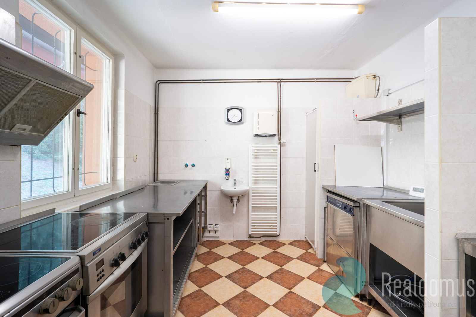 Centrální společenská místnost s barem a krbem. Přípravna jídla, prádelna, skladové prostory. V suterénu za garážemi se nachází sauna. Technická místnost s centrálním kotlem.