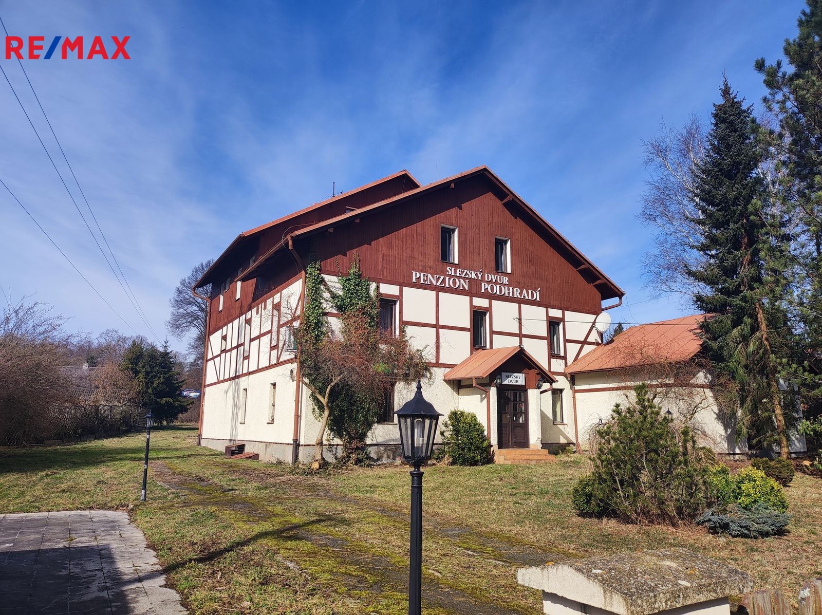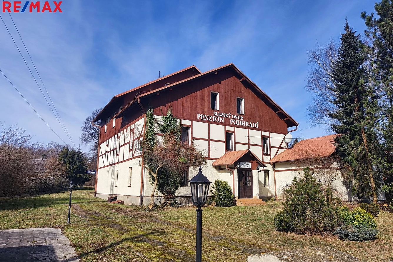 Nabízíme k prodeji penzion Slezský dvůr s možností celoročního provozu v rekreačně a turisticky velmi atraktivní lokalitě části obce Podhradí vzdáleném cca 25 min. od Opavy.Celý areál se nachází v chatové oblasti u řeky Moravice pod zříceninou hradu Vikštejn. V penzionu je 17 pokojů, 1 apartmán, všechny s vlastním sociálním zařízením,některé s balkónem, celková kapacita je 50 lůžek. Vybaveno starším nábytkem. Pivnice, denní restaurace,salónek. Kuchyně s původním zařízením. Rozsáhlý vlastní pozemek o celkové výměře 2500m2 umožňuje sportovní a kulturní vyžití, příp. rozšíření ubytovacích kapacit /stany/. Venkovní kiosek s možností grilování, pořádání akcí pod širým nebem. Penzion je svým charakterem a umístěním ideální pro školy a školky v přírodě, sportovní akce pořádané mládežnickými kluby, relaxační pobyty všeho druhu.