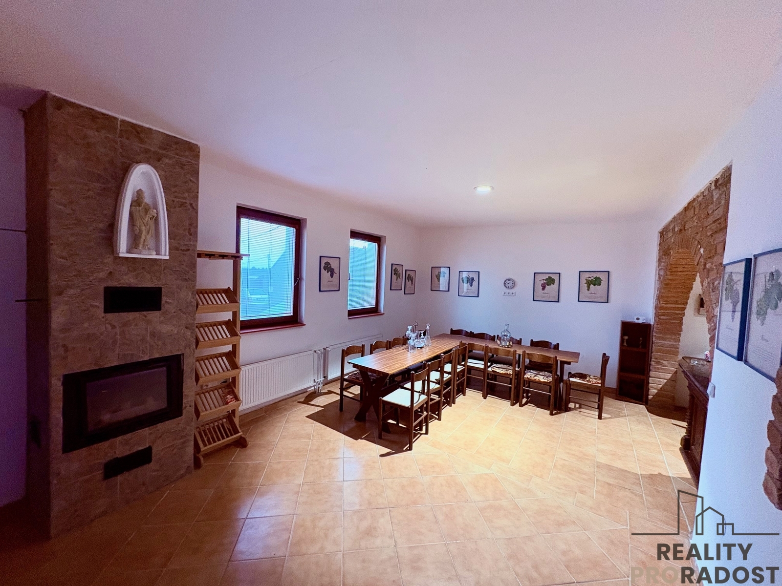 Součástí domu je historický habánský sklep s nezaměnitelnou atmosférou a nachází se hned vedle skvělého zázemí pro minimálně 20 hostů. Tento prostor nabízí velkou otevřenou místnost s kuchyňským koutem, krbovými kamny a slouží pro oslavy, různé společenské akce, degustace nebo přátelská posezení. V přízemí je opět nové sociální zařízení, které zajišťuje pohodlí hostů.