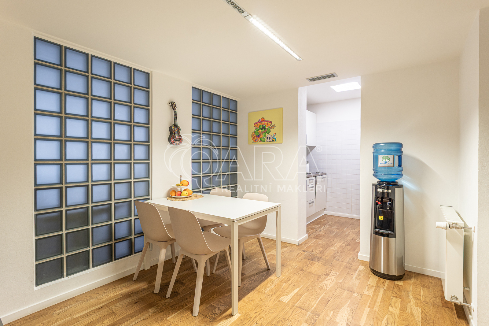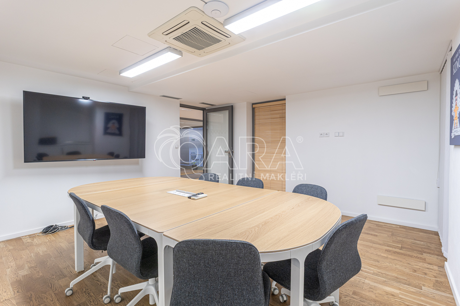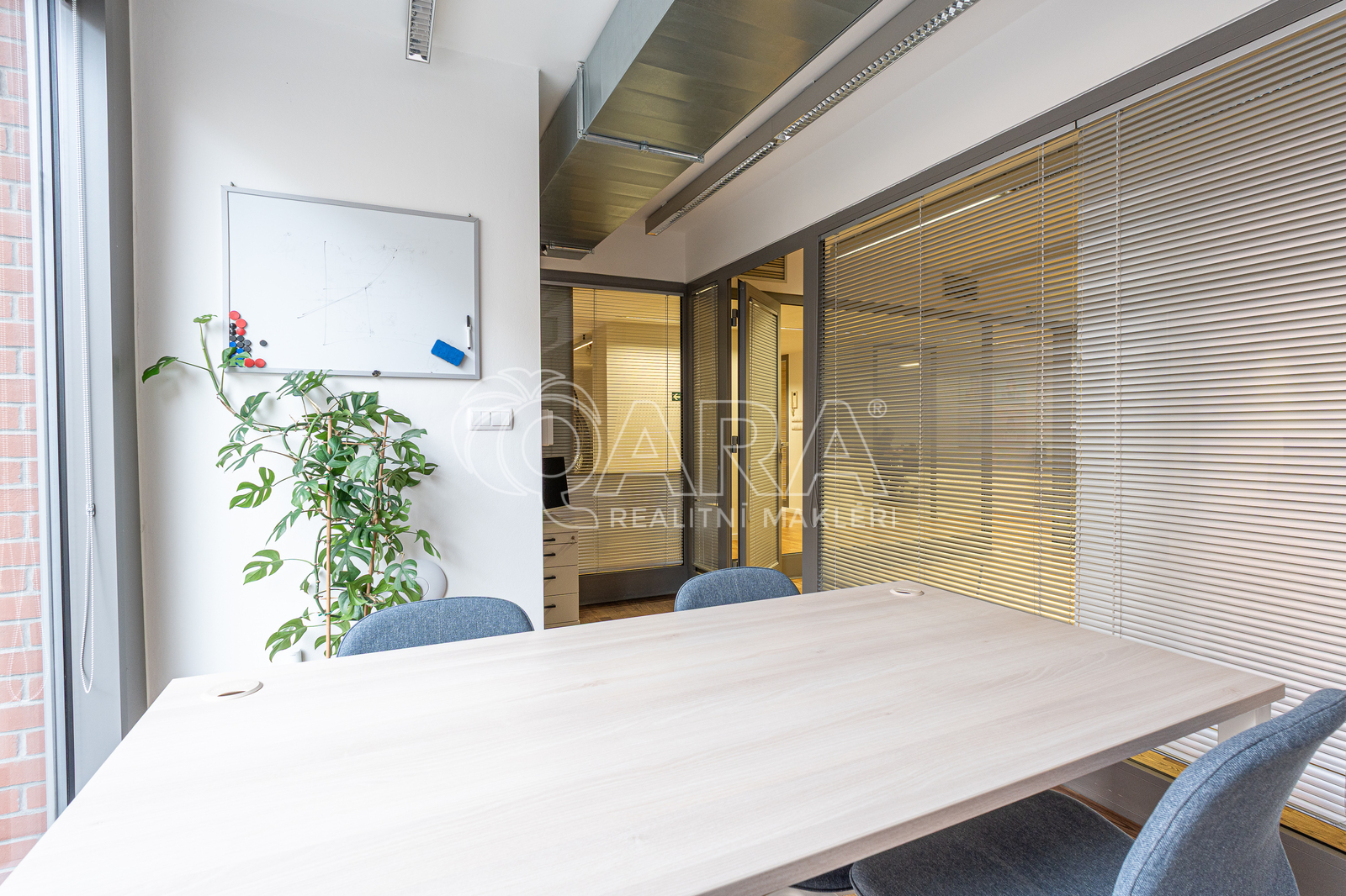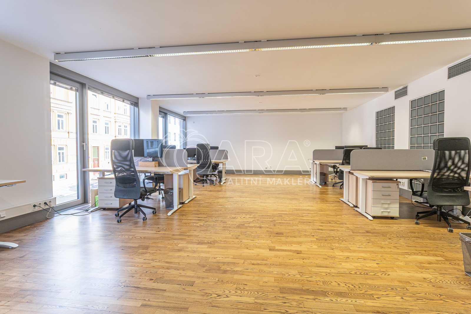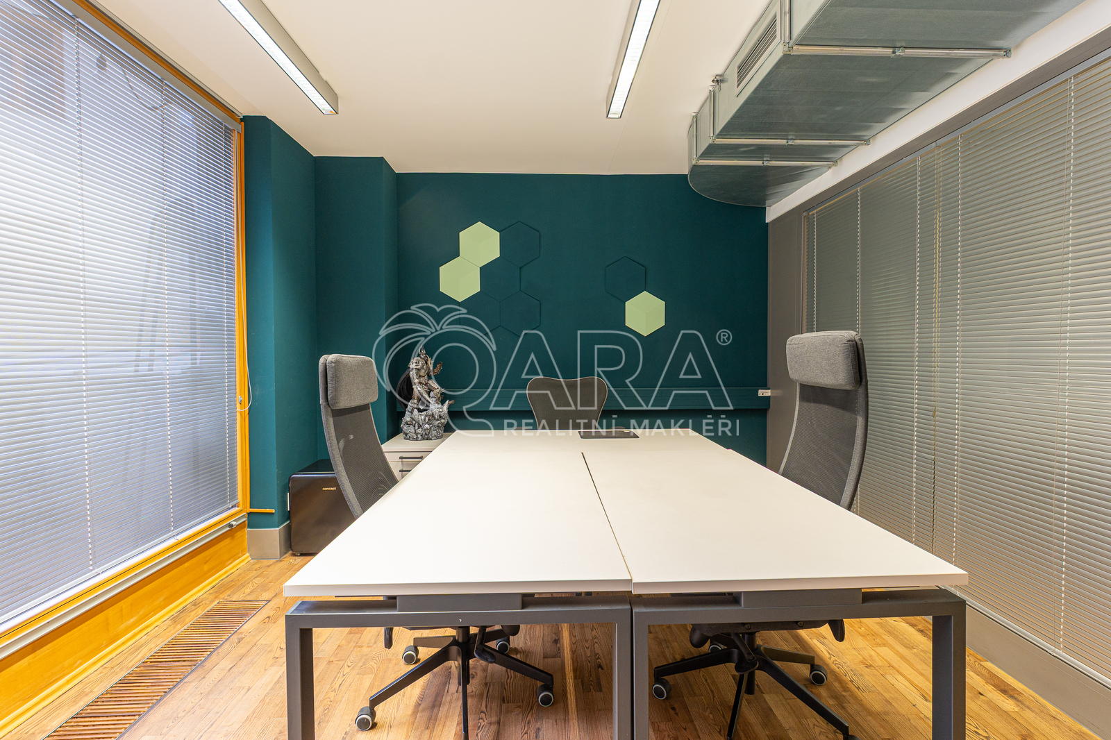 Prostor o celkové rozloze kanceláří 335 m² je plně klimatizovaný. Dispozice nabízí dvě větší otevřené místnosti, dvě místnosti oddělené skleněnou stěnou, přičemž jedna z nich má vstup na terasu o velikosti 17 m², samostatnou uzavřenou místnost, zasedací místnost a prostor pro recepci či posezení návštěv. Zázemí zahrnuje kuchyňku, jídelní kout, 2x moderní sociální zařízení se sprchou, serverovnu a úklidovou místnost.