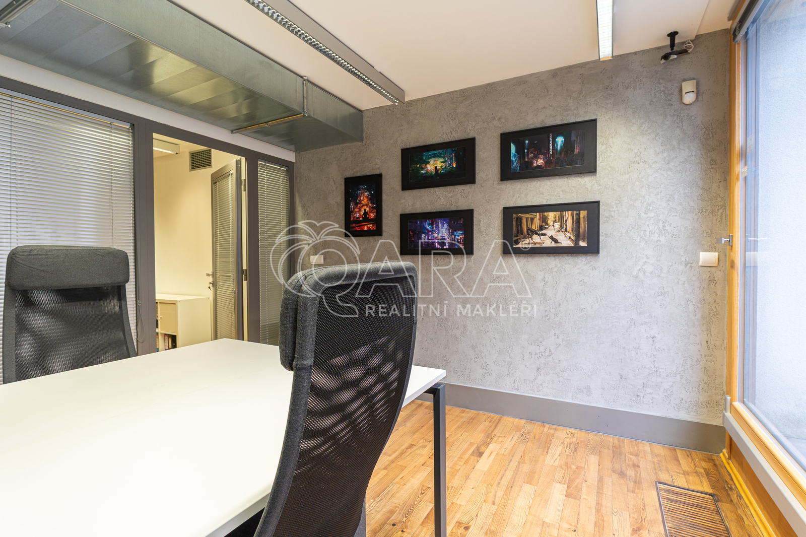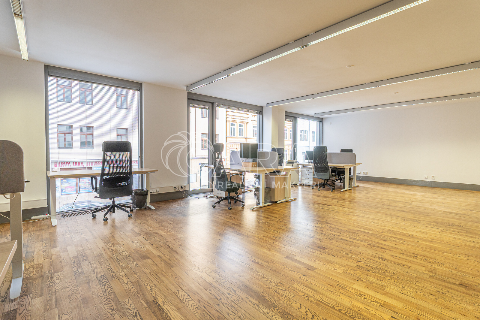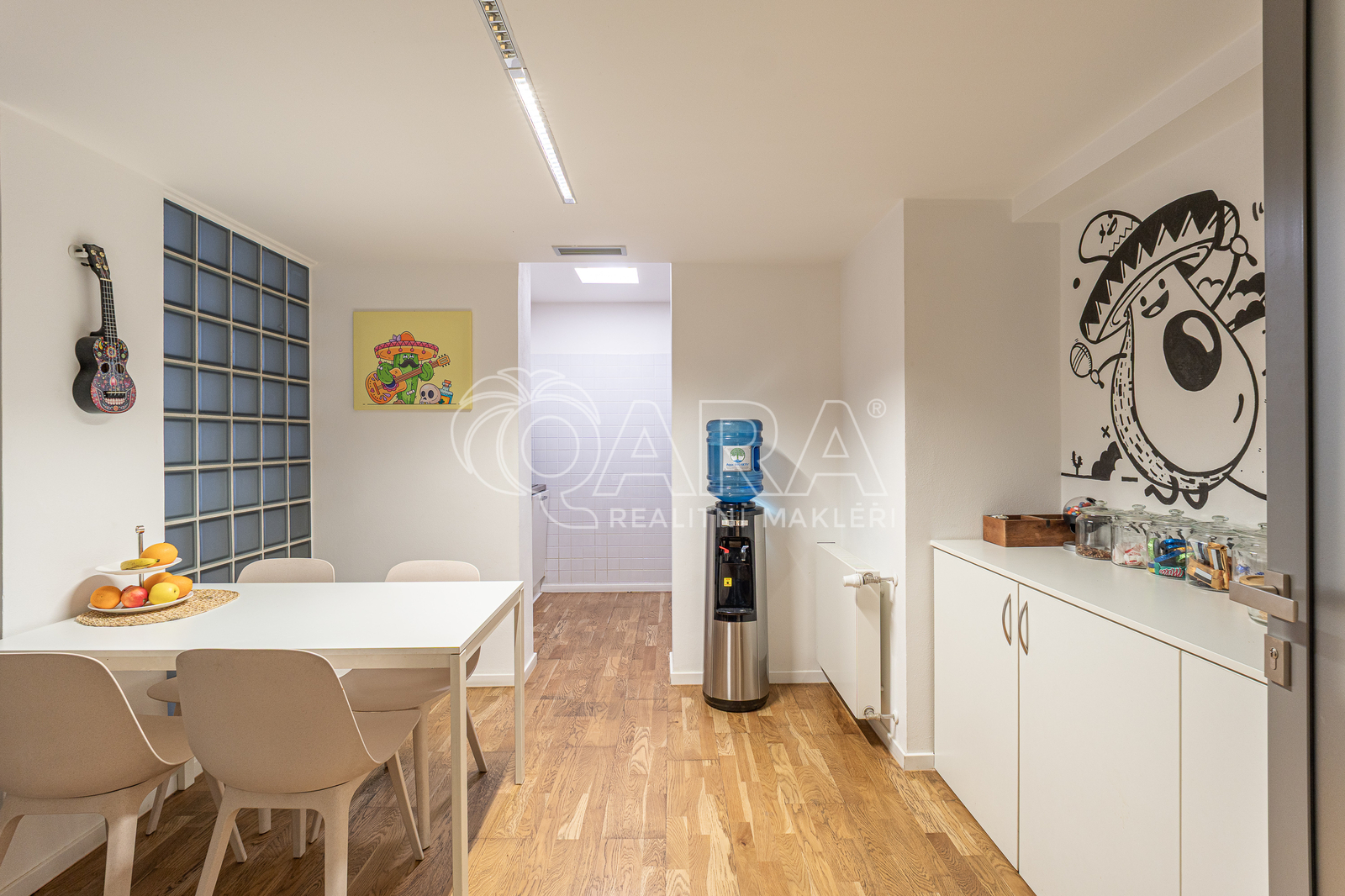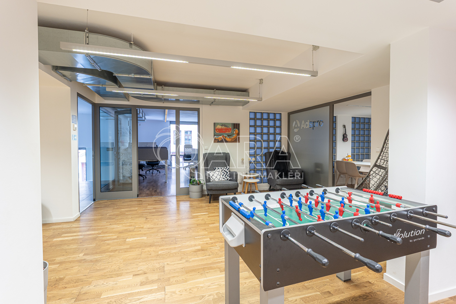 Prostor o celkové rozloze kanceláří 335 m² je plně klimatizovaný. Dispozice nabízí dvě větší otevřené místnosti, dvě místnosti oddělené skleněnou stěnou, přičemž jedna z nich má vstup na terasu o velikosti 17 m², samostatnou uzavřenou místnost, zasedací místnost a prostor pro recepci či posezení návštěv. Zázemí zahrnuje kuchyňku, jídelní kout, 2x moderní sociální zařízení se sprchou, serverovnu a úklidovou místnost.
