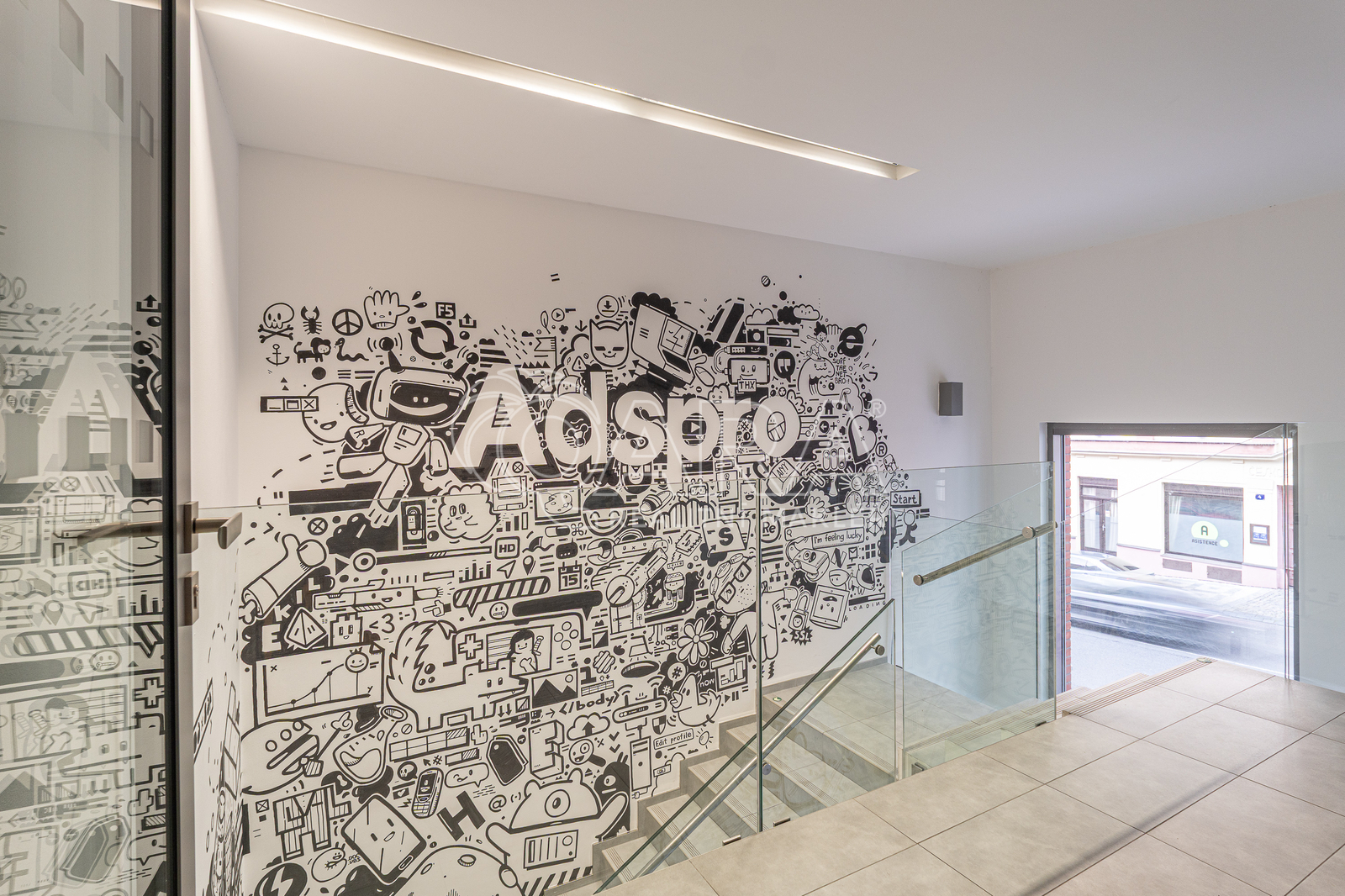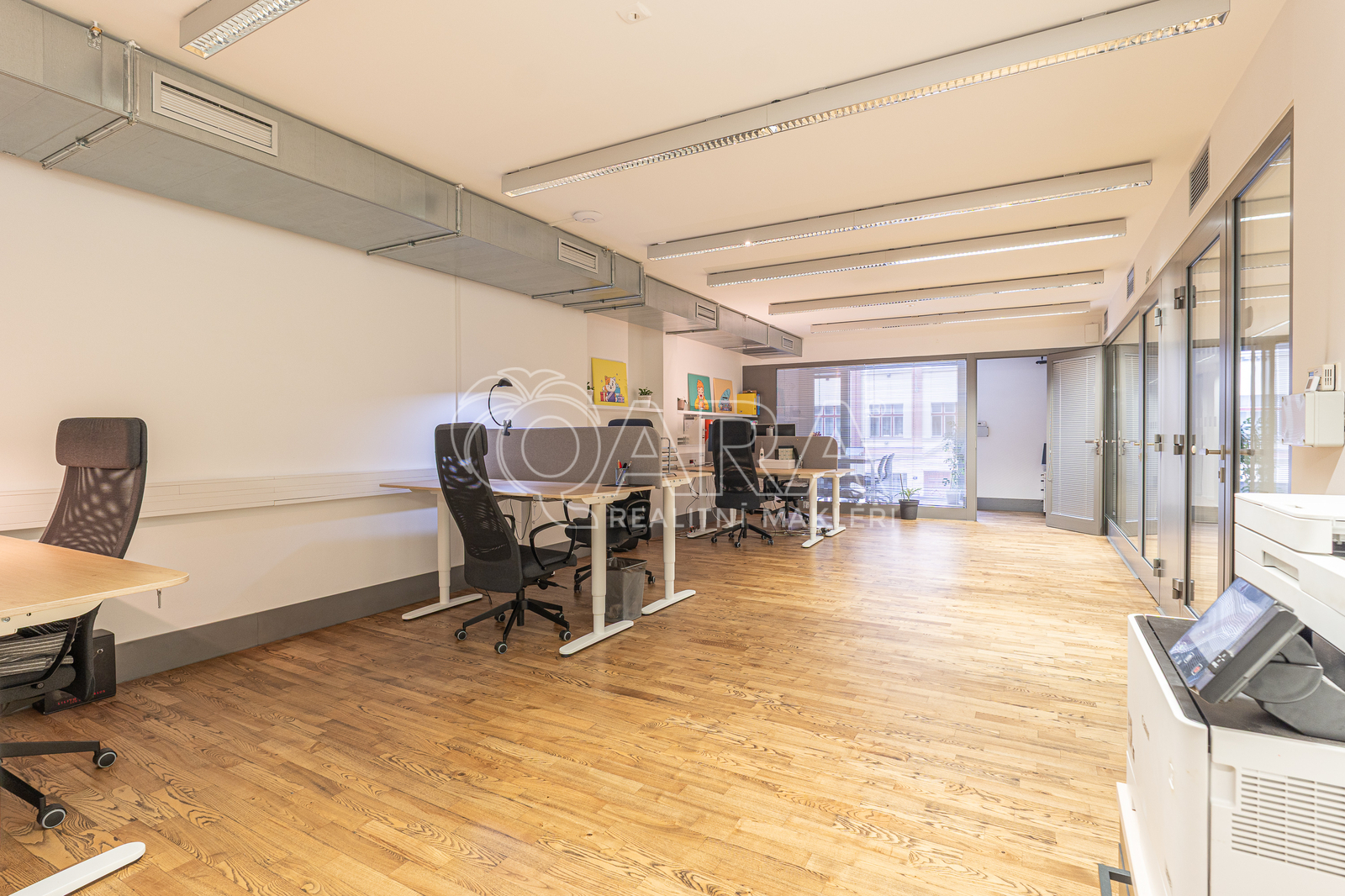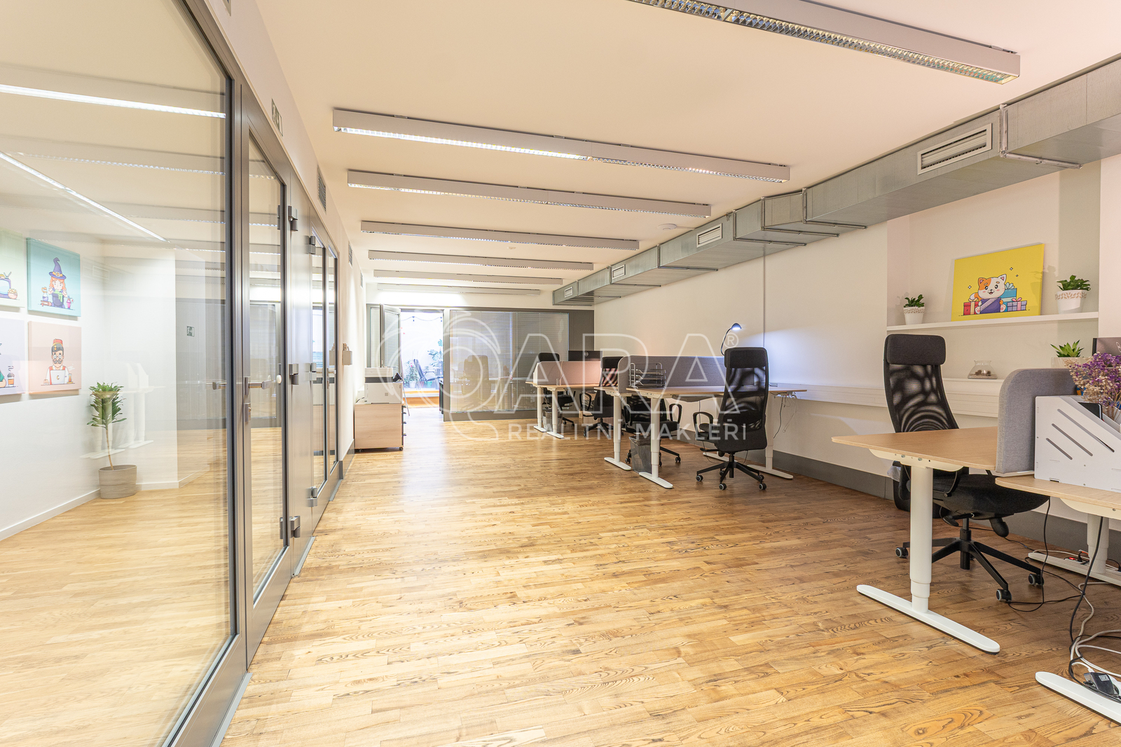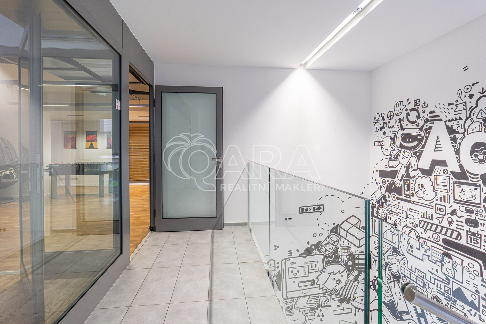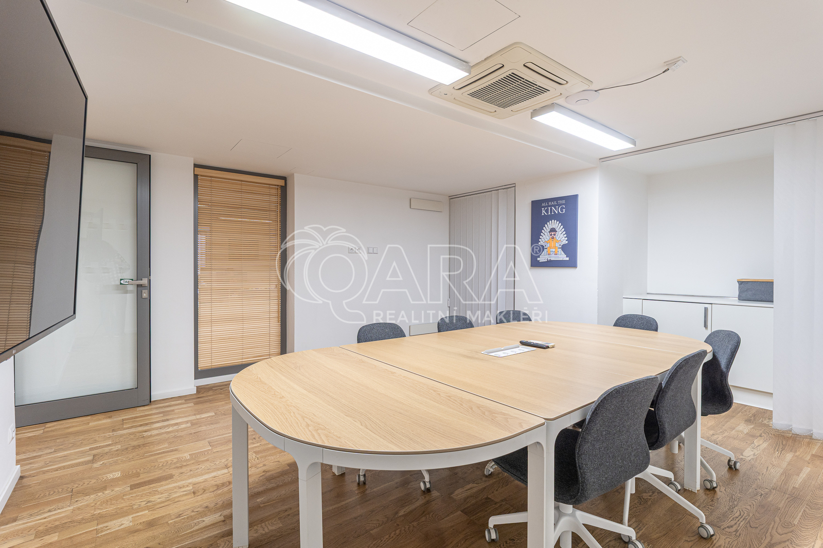 Prostor o celkové rozloze kanceláří 335 m² je plně klimatizovaný. Dispozice nabízí dvě větší otevřené místnosti, dvě místnosti oddělené skleněnou stěnou, přičemž jedna z nich má vstup na terasu o velikosti 17 m², samostatnou uzavřenou místnost, zasedací místnost a prostor pro recepci či posezení návštěv. Zázemí zahrnuje kuchyňku, jídelní kout, 2x moderní sociální zařízení se sprchou, serverovnu a úklidovou místnost.