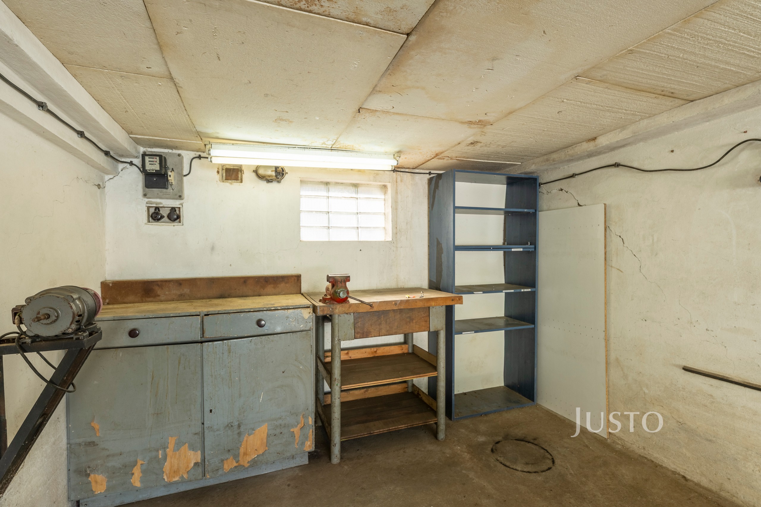 V garáži je i ponk se svěrákem, bruska a regál.