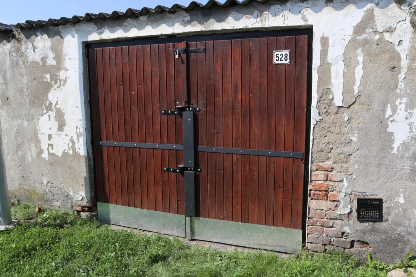 Dřevěná vrata 2,4 m, 3x zámek - vrata jsou oplechovaná, natřená + nová závora, v roce 2021 se opravovaly stěny + se dělali vnitřní omítky, výmalba,