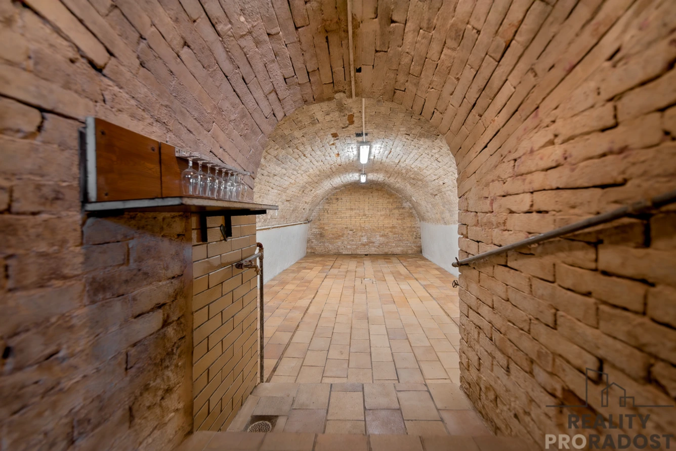 A pak přichází to nejlepší:Nádherný cihlový sklep s klenbou, suchý, voňavý a čistý. Majitelé jej dokonce rozšířili o boční sklípek s archivními boxy – ideální pro uložení těch nejlepších lahví.