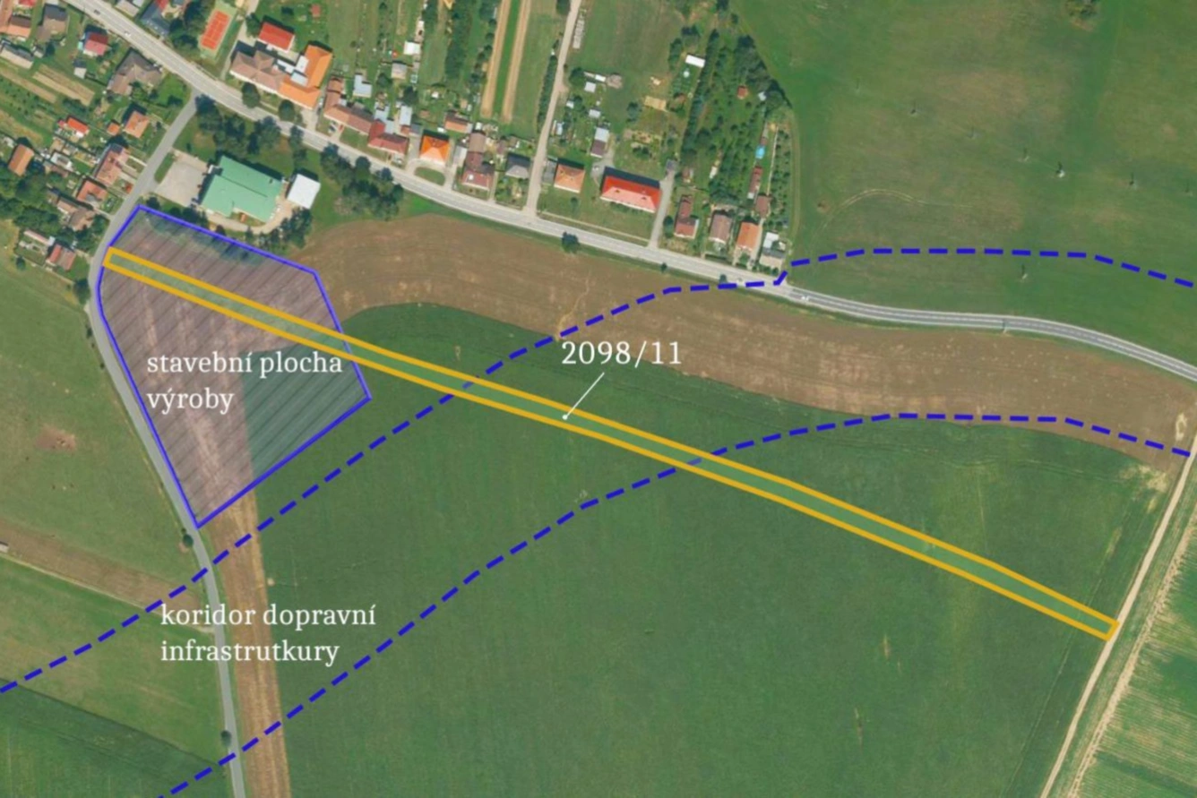 Zapsána je na listu vlastnictví 805 pod číslem 2098/11. Její celková výměra je 5 761 m2. Nachází se jihovýchodně od zastavěného území obce. Dle územního plánu její západní část leží ve stavební ploše výroby a skladování pro drobnou a řemeslnou výrobu. Z celkové plochy se jedná přibližně o 1 100 m2. Dále parcelou prochází koridor dopravní infrastruktury pro plánovanou přeložku