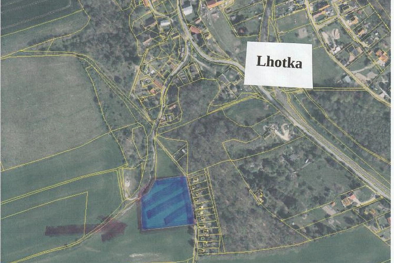 Poz. 7121m2 ve Lhotce u Mělníka, u zástavby, přístup ze dvou stran, žádná ochr. pásma.
