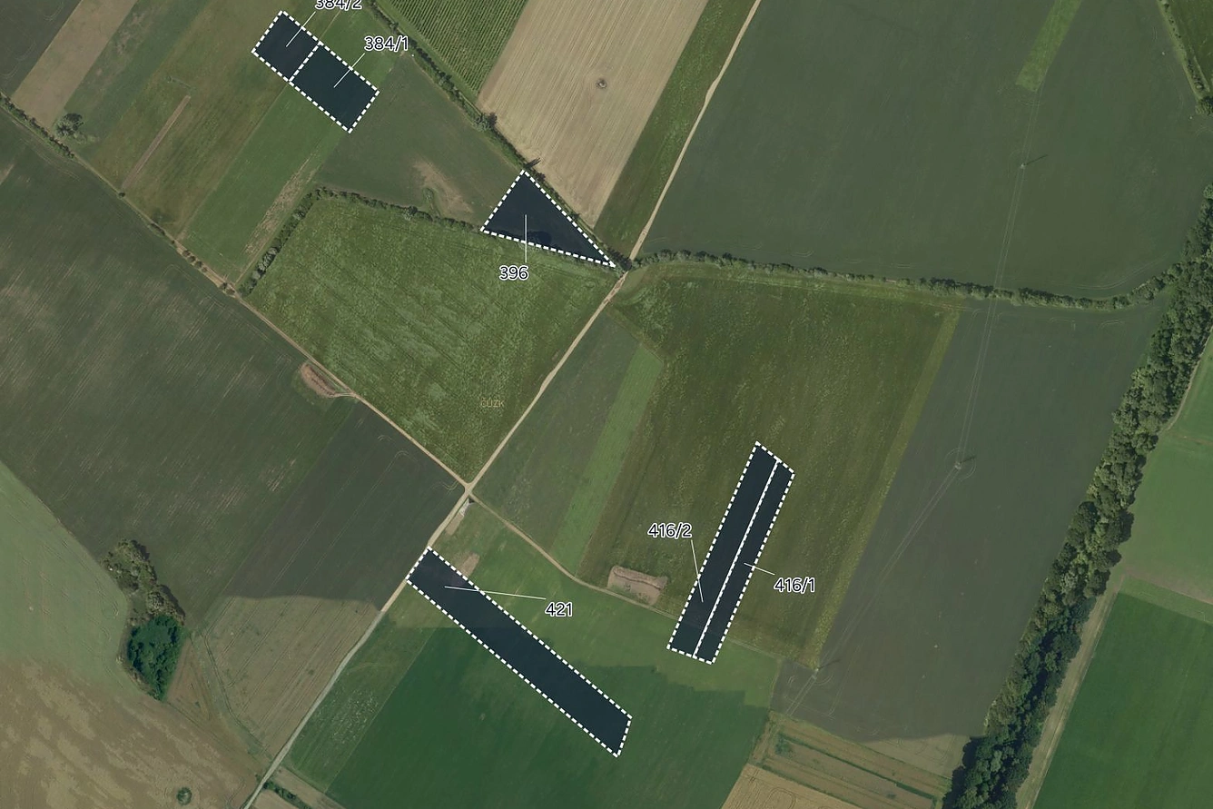 K prodeji je vlastnictví na parc. č. 384/1, 384/2, 416/1 a 416/2 zapsaných na LV 551 KÚ Drválovice a dále vlastnictví na parc. č. 396 a 421 zapsaných na LV 21 KÚ Drválovice