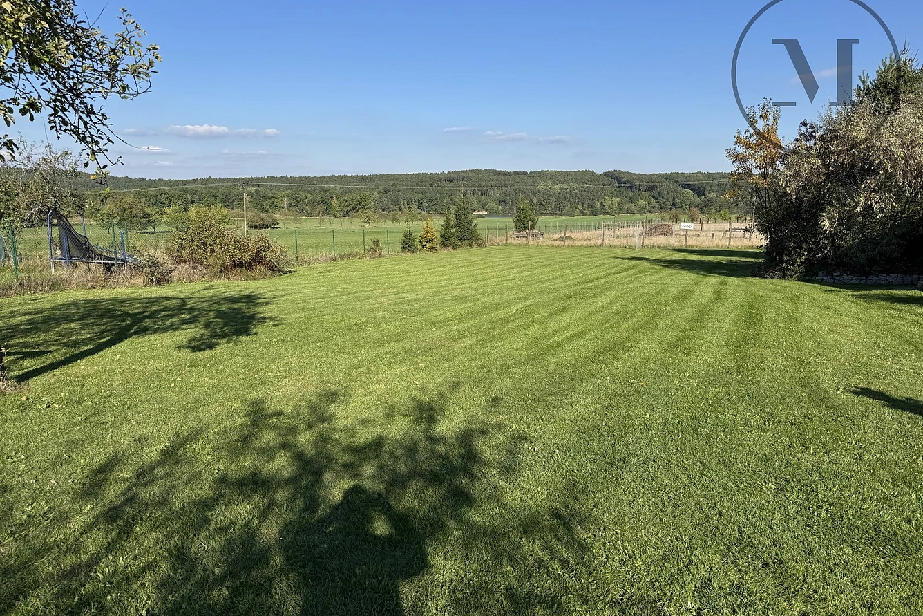 Pozemek je travnatý, rovinatý, doplněný o vzrostlé stromy, keře a krásnou zeleň, které vytvářejí příjemnou atmosféru soukromí. Z parcely je úchvatný výhled do krajiny – vidíte rybník a oboru s daňky, a jen pár kroků od hranice pozemku začíná les.